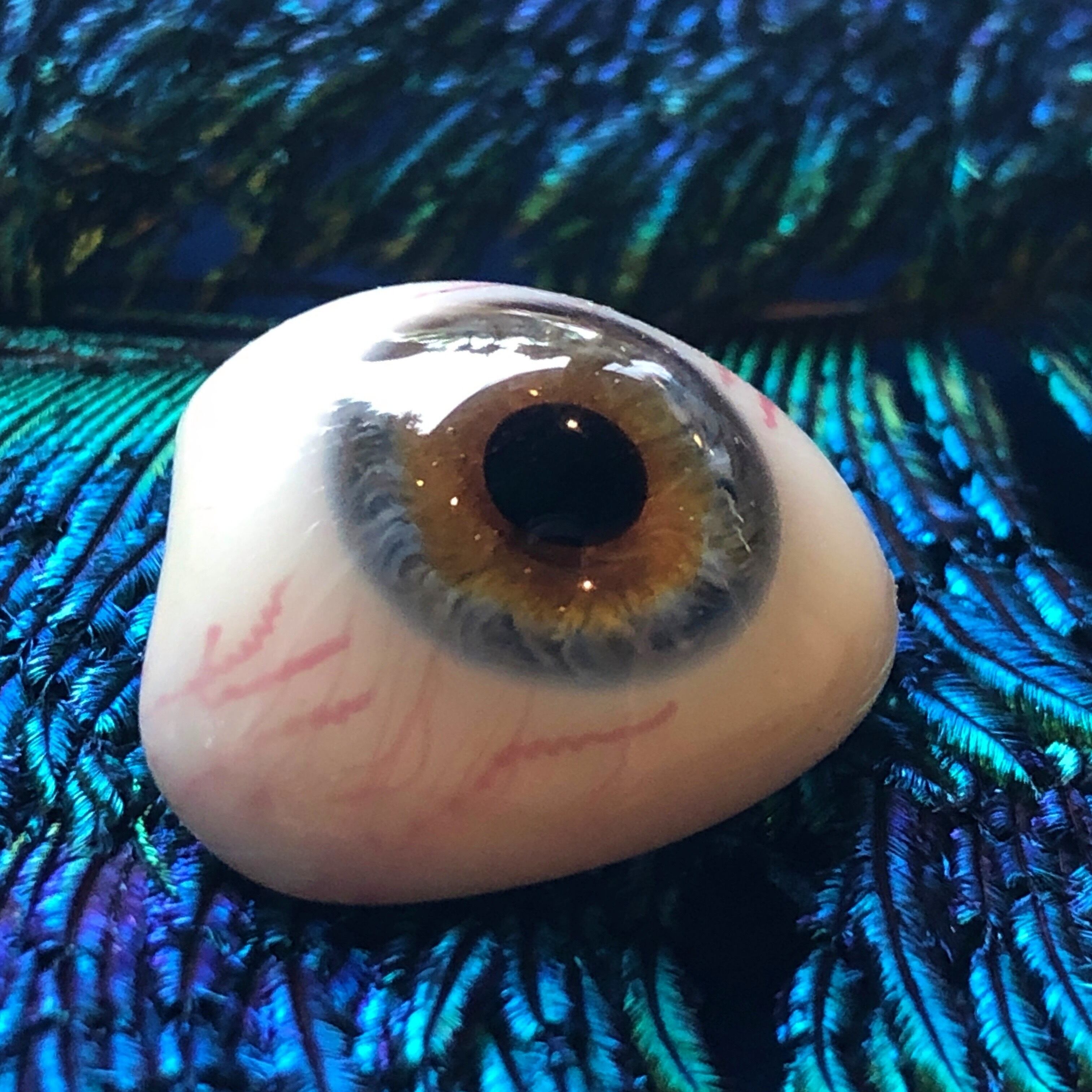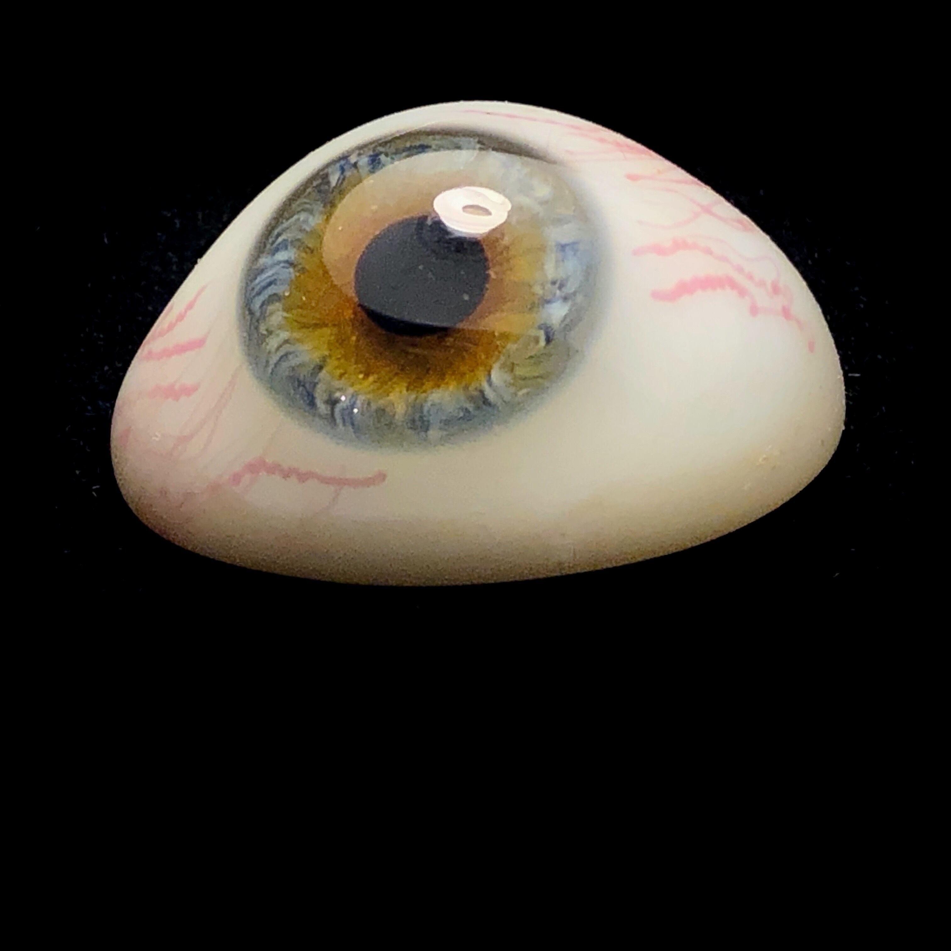 こちらのガラス義眼はドイツ、チューリンゲン州、ラウシャの "Theodor Müller-Hipper" の手によるもので、その商標にはチューリンゲン州の「最高品質認定」の記載があります。ラウシャは古くから優れたガラス工芸の町でしたが、19世紀にイタリアから義眼製作の技術が伝わり、19世紀の末までにはガラス義眼で有名になりました。今でもその技術を使って、カスタムのドールアイなどを製作しているそうです。