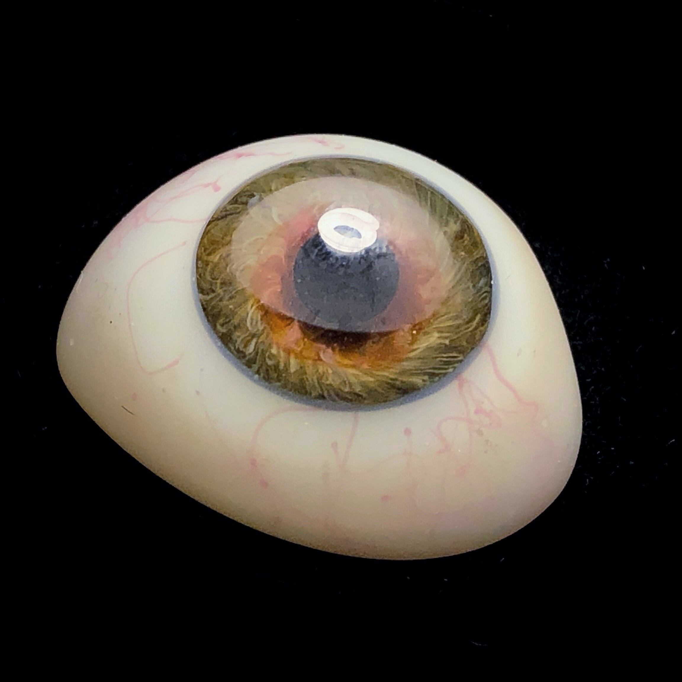 こちらの義眼の虹彩の初見は美しい黒です。この闇に行く手を示す希望の灯りのように炎が燃えています。珍しく、とてもドラマティックな表現のお品です。