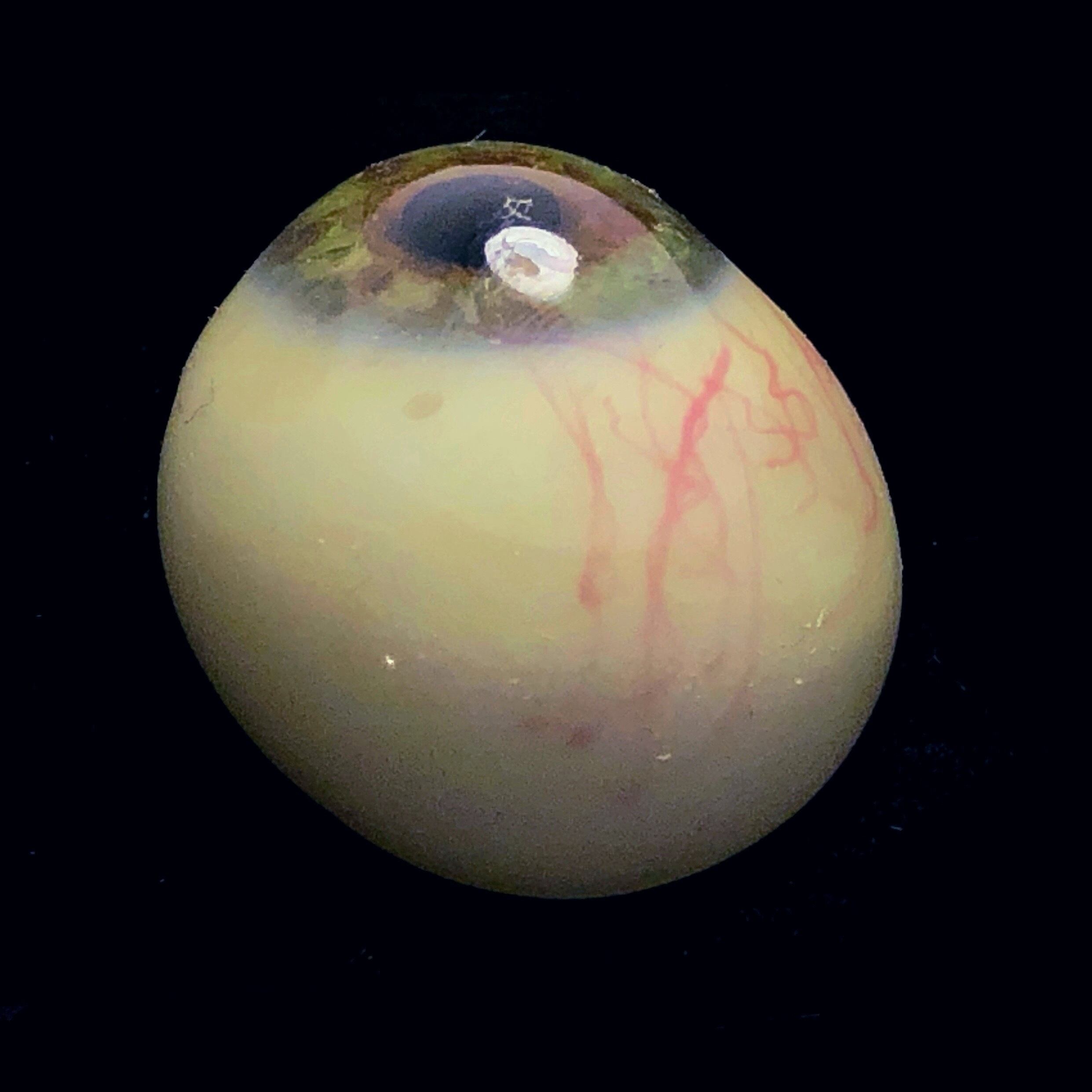 こちらのガラス義眼はドイツ、チューリンゲン州、ラウシャの "Theodor Müller-Hipper" の手によるもので、その商標にはチューリンゲン州の「最高品質認定」の記載があります。ラウシャは古くから優れたガラス工芸の町でしたが、19世紀にイタリアから義眼製作の技術が伝わり、19世紀の末までにはガラス義眼で有名になりました。今でもその技術を使って、カスタムのドールアイなどを製作しているそうです。