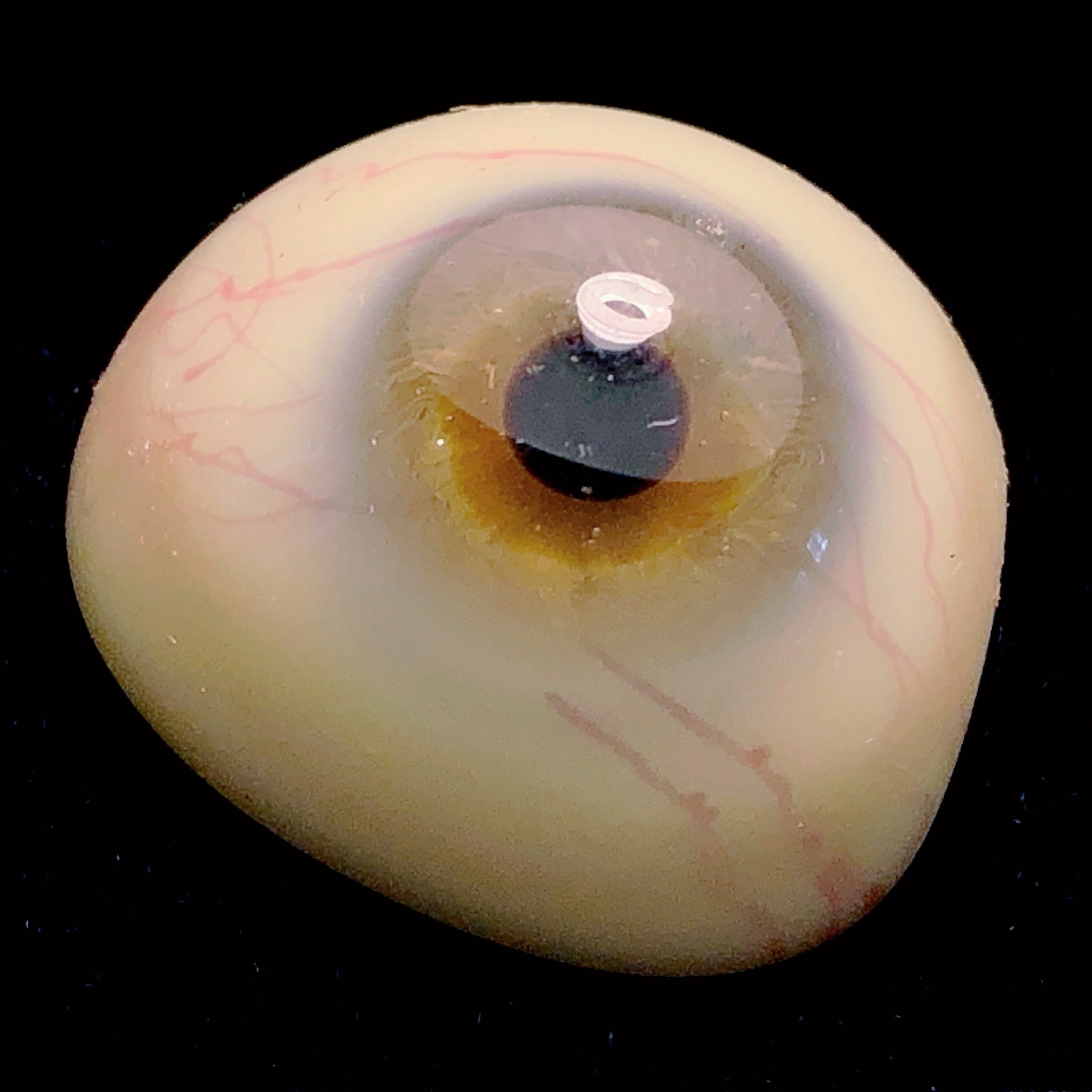 光を反射ではなく内包した不思議な玉が、薄青の霧に守られている。透明度の高いガラスならではの神秘的な景色の義眼です。