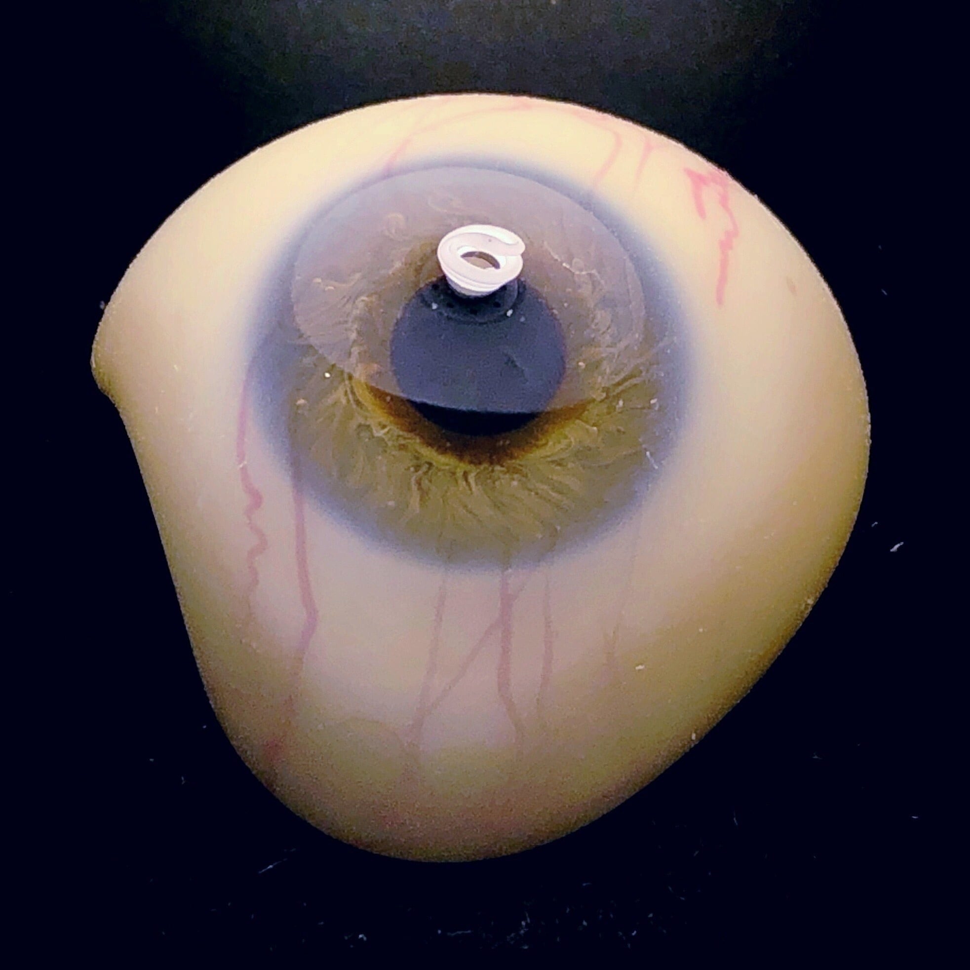 外縁のリングは薄い藍色の靄です。ぼおっと湧いたようなこの複雑な景色は、単調な青ではないだけに、これまでのブルー系の義眼とはひと味もふた味も違う幻想的な美しさです。その靄が次第に薄くなる向こうに、とろりとした蜂蜜色の上に藍色や白の筋が渦を巻く様子が透けて見えます。靄が光を乱反射させて、あたりがぼんやりと明るくなっているかのようで、その靄を透かして見えるという表現も、これまでの義眼と違って大変ユニークです。さらに内側は靄が完全に途切れて、濃いめのハニーブラウンの上に黒目が浮いています。