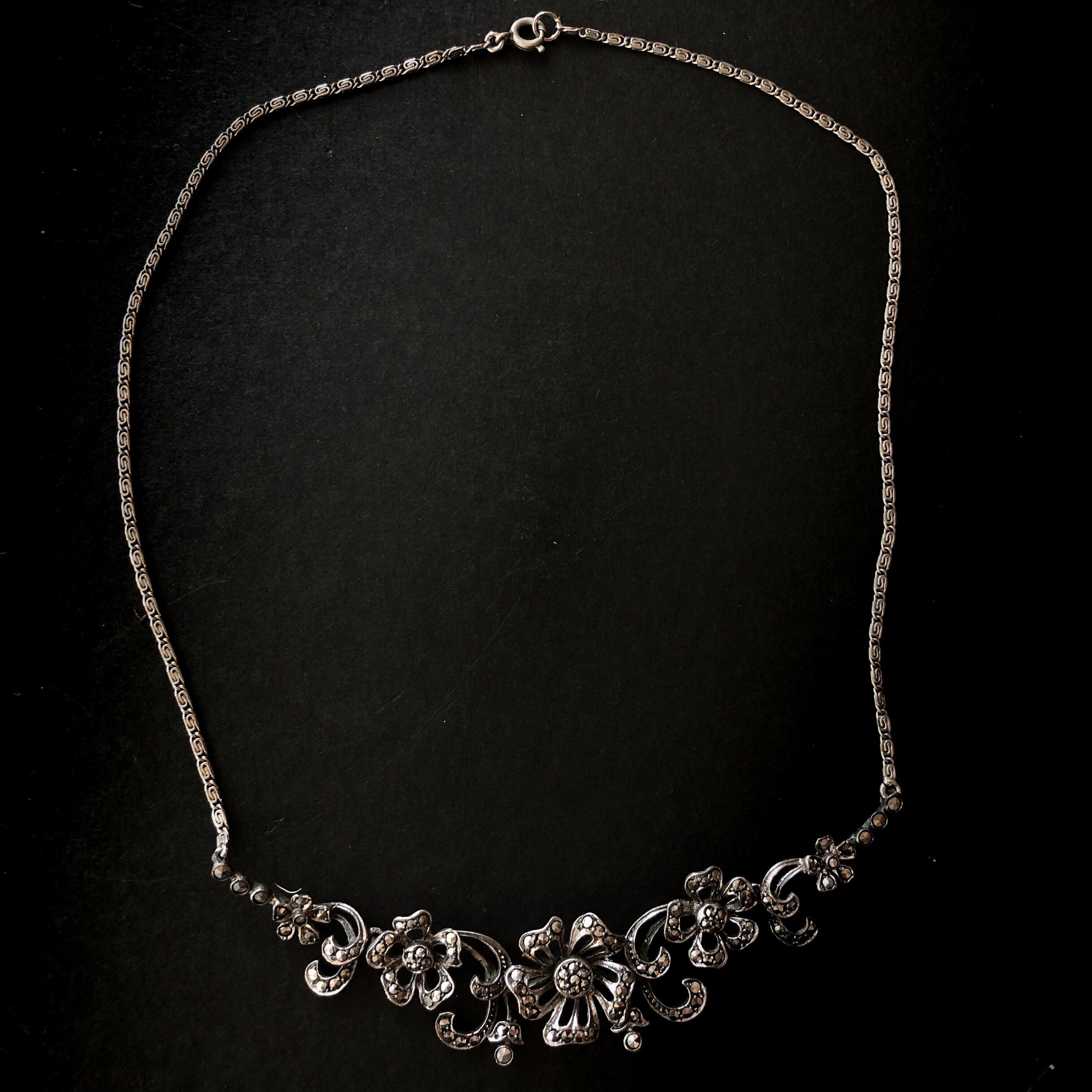 花と蔓模様の曲線が複雑に絡み合う意匠はメタリックでエレガント、長い時の流れがこのネックレスに光と陰の静謐な美しさを纏わせています。