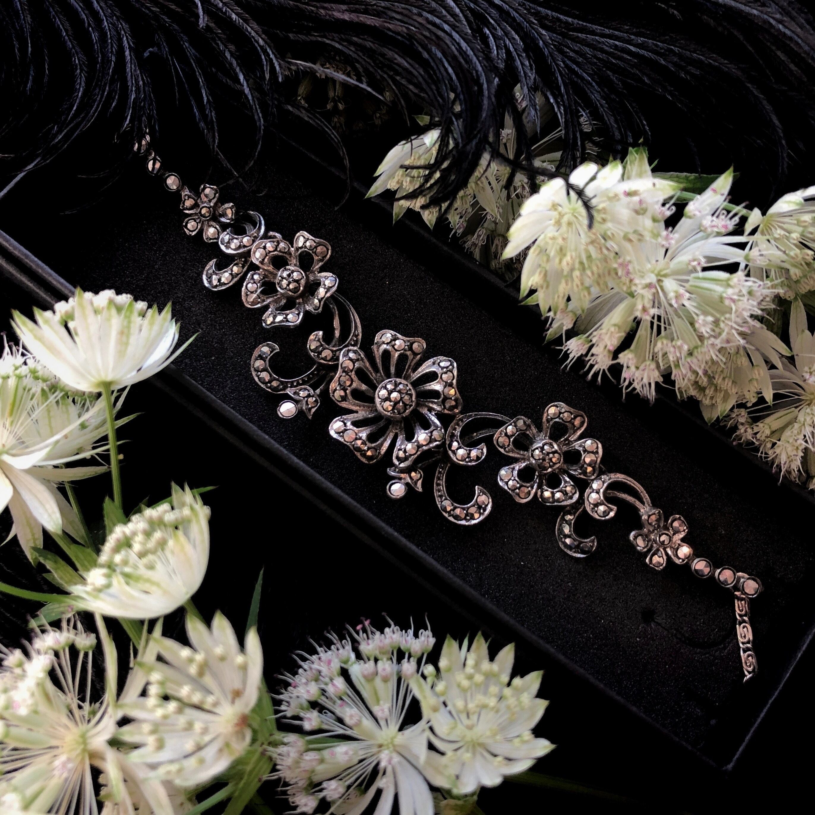 ふんだんに散りばめられたマーカサイトが光の加減で鋭く煌きます。鈍い銀色の台座は古色を帯びてとても深い陰影をまとい、どこにも黒い彩色はされていないにもかかわらず、銀と黒、光沢のあるモノトーンの世界観が強く感じられます。チェーンもオリジナルで、こちらも丁寧な仕上がりでよい質感です。