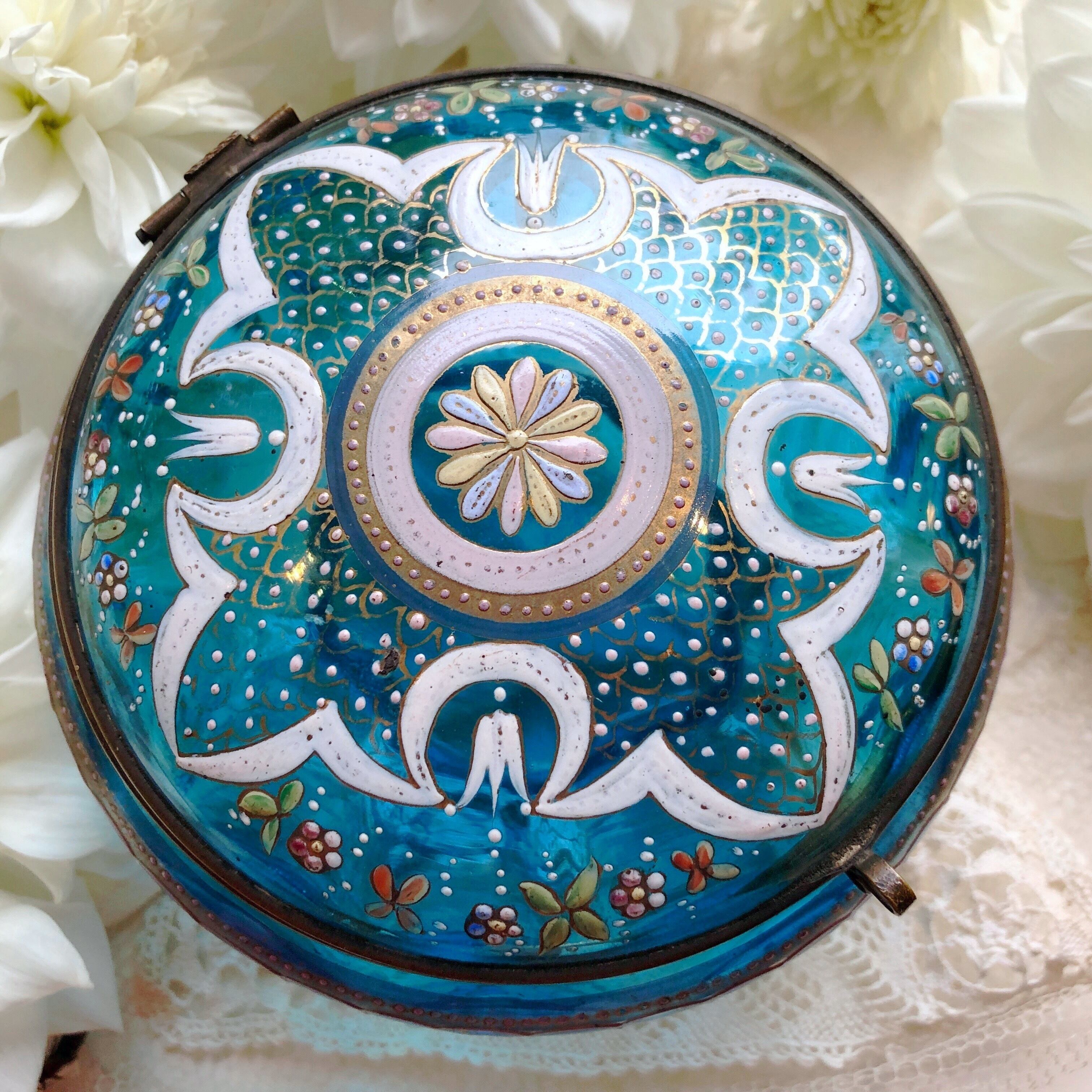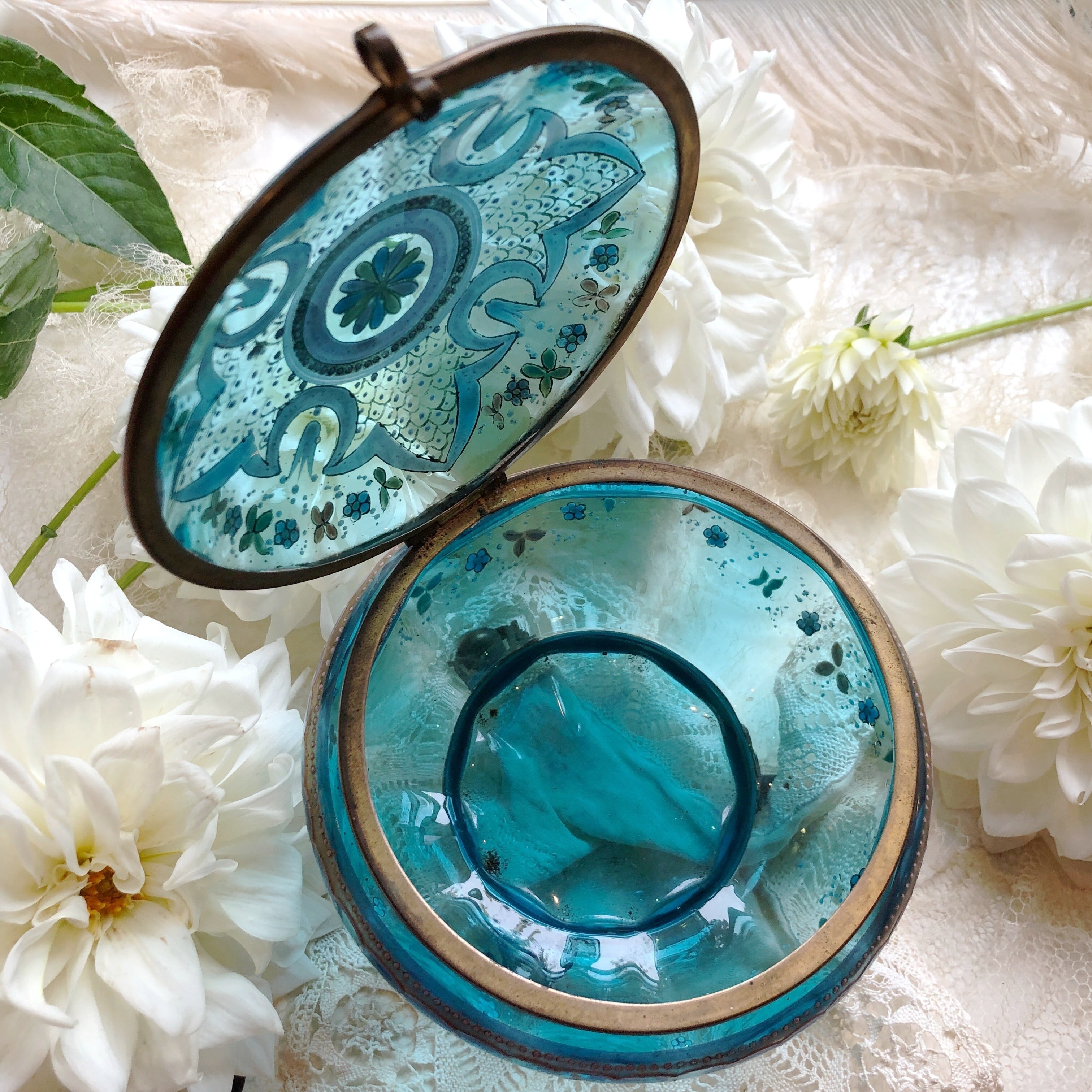 アクアブルーのガラス、金彩や白、穏やかな色彩のエナメルで艶やかに施された装飾、それらとよくマッチしたフォルム、金属の脚の凝った仕上がりまで、全てが見事に調和した美しいボンボニエールです。