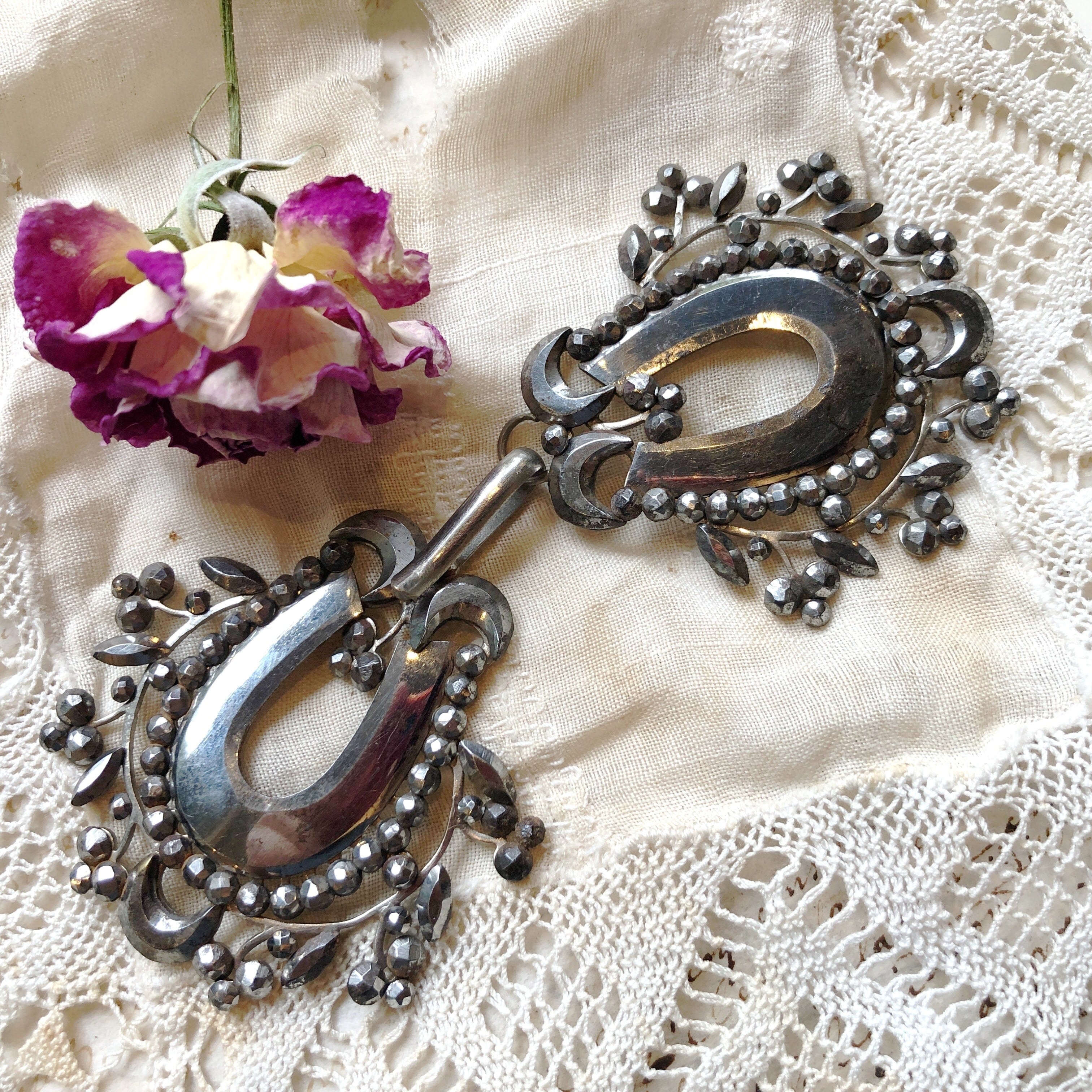 幸運を受けとめるという馬蹄形の周囲に植物を散りばめた、優雅な中にも重厚な意匠の金属製襟留めです。こちらは "boucle de cape" と申しましてコートやマント、ケープなどの襟に縫い付けてバックルとして使います。デザインの中に各3箇所ずつ半円の環があるのでそこに糸を通してお手持ちの衣装に縫い付けてお使い下さい。