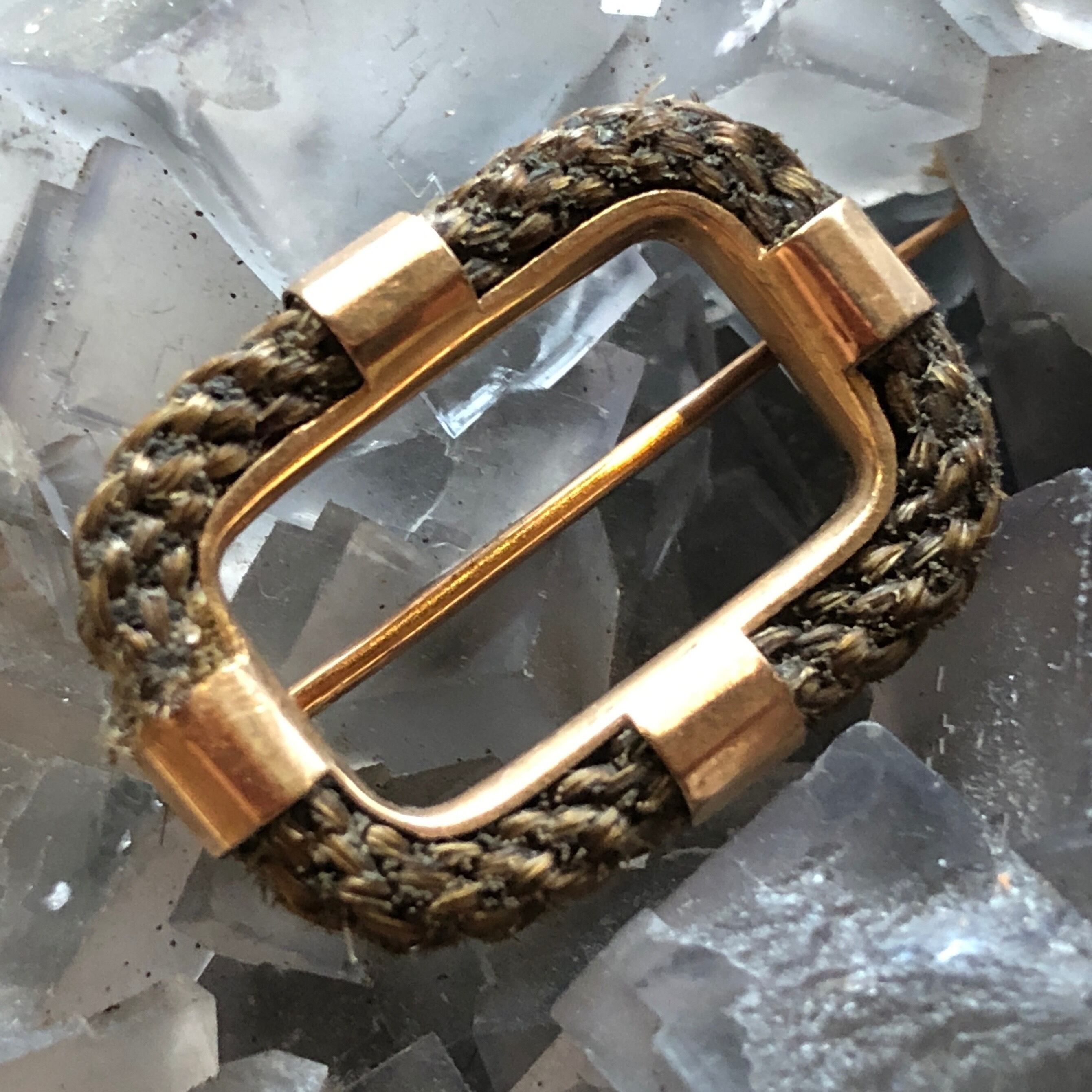 深みのある栗色と台座のしっとりした金色のコンビネーションがとても美しいブローチです。こちらは栗色の毛髪を綺麗に編み上げたものです。お亡くなりになった、あるいは遠くへ行ってしまいもう会うことはできない、そういう方の思い出を常に身近に置きたいという想いから造られました。