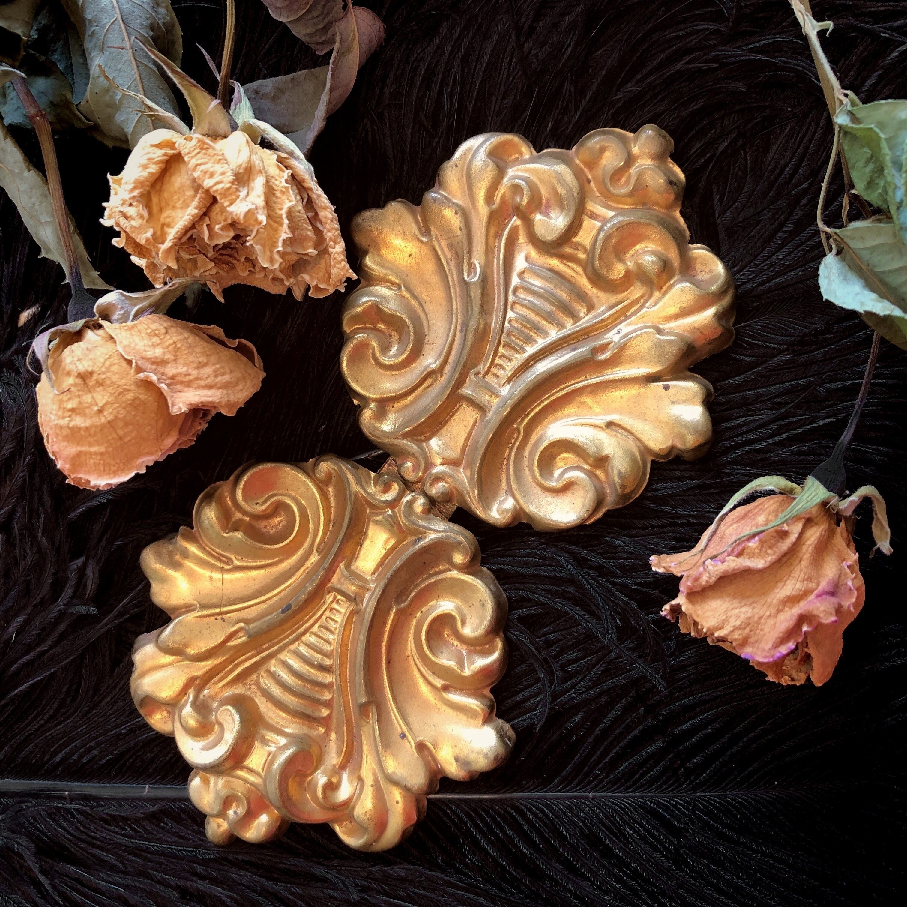 アカンサスの葉をモチーフにした紋様を大胆に型押しした、華やかな中にも重厚な意匠の金属製襟留めです。こちらは "boucle de cape" と申しましてコートやマント、ケープなどの襟に縫い付けてバックルとして使います。裏に取り付けられた棒を利用して、お手持ちの衣装に縫い付けてお使い下さい。