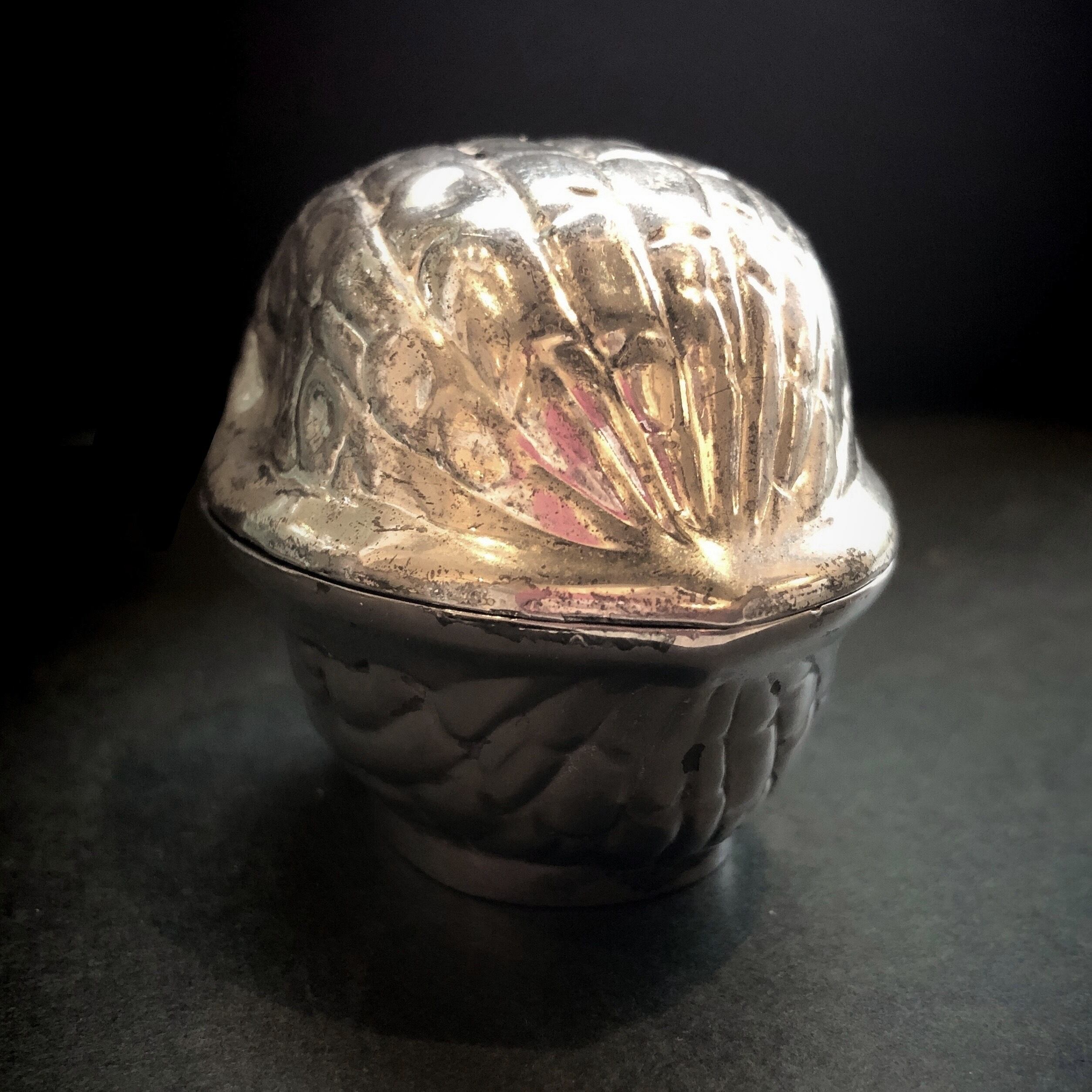 こちらはその形、大きさからロザリオケースと称しておりますが、もちろんジュエリーケース、小物入れなどにもお使いいただけます。ずっしりと重量感のある金属に銀メッキを施したごろんと大粒のクルミの実は存在感があり、自然の造形を模したランダムでリアルな曲線が印象的です。銀色の表面には古色が積もり、黒みを帯びたり剥げて輝きを失った部分もありますが、それが陰影を深めて全体に落ち着いた古いもの独特の質感を与えています。