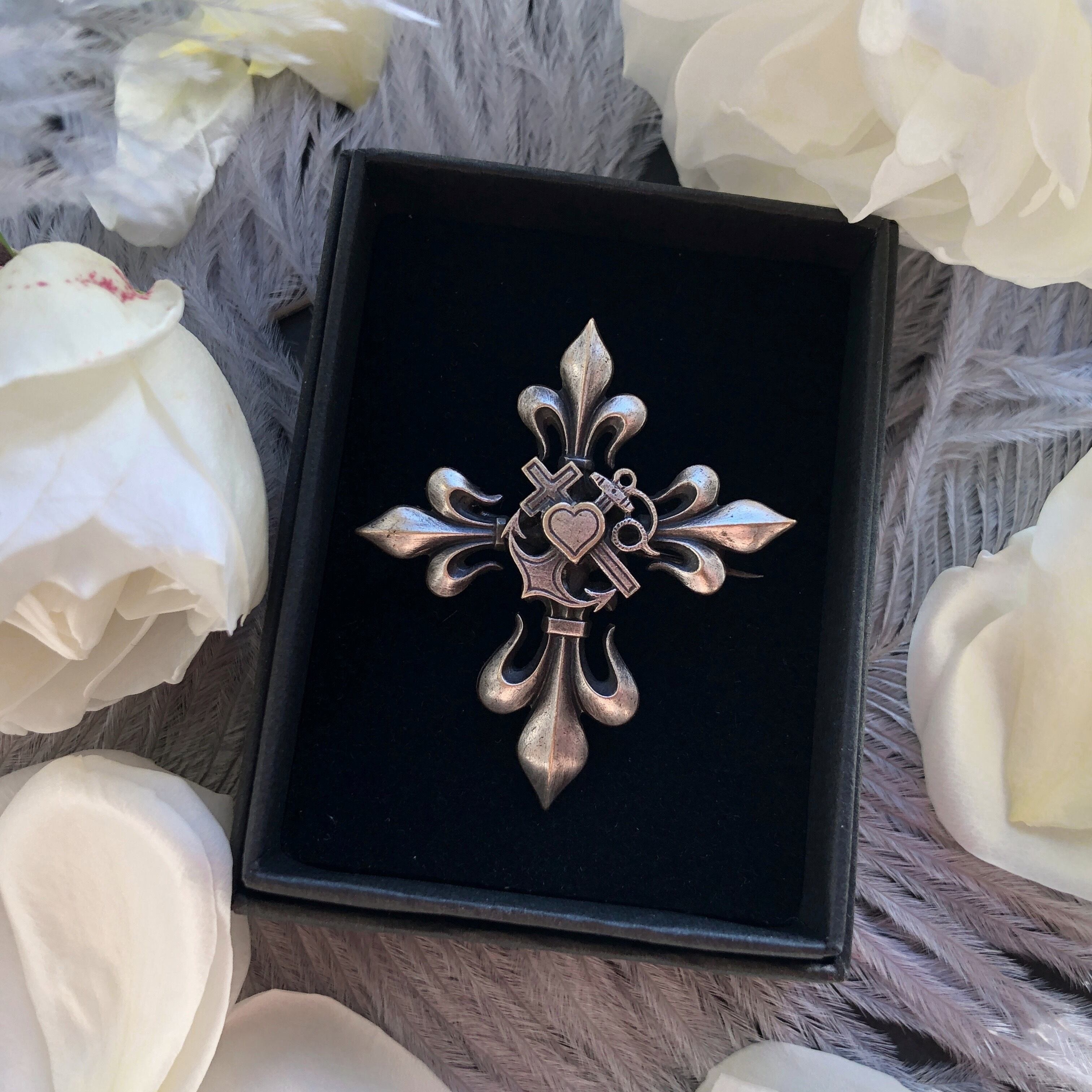 フルール・ド・リスの中央にハート、錨、十字架を置いたブローチです。この3つのアイテムは、それぞれ愛、希望、信仰を表し、錨は他にも安定や力の象徴でもあります。