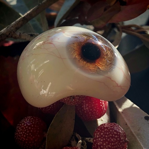 この義眼は黒目の周囲から黒みを帯びた赤、その外側がほんのり黄みを帯びて薄くなった赤、そこに白い筋が踊り始め、やがて黒みを帯びた淡い青の靄が立ち昇るようにそれらを覆っていきます。それは、水と光と同じように、透明度の高いガラスだけが生み出すことのできる幻です。たっぷりの光を含み、奥の奥まで広がっているかのような幻想の世界に引き込まれないように、どうぞご注意ください。