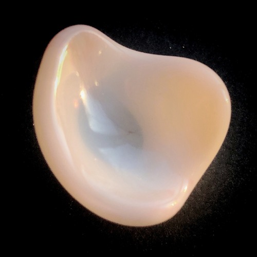 室内光でも美しいのですが、ぜひ自然光のもとでご覧ください。ダークなガラスの塊が光をたっぷりと含んだ姿に変貌します。また、裏側から光が入りますので、直射日光で目を傷めないように注意して、裏から光を当てて見てください。黒い円が薄い緑を帯びた冠をいただく姿をご覧になることができます。
