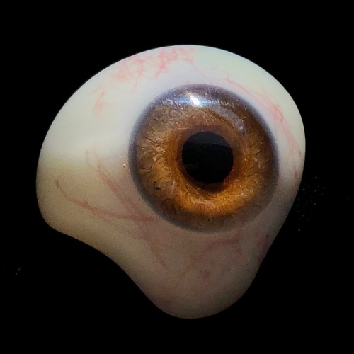 こちらのガラス義眼はドイツ、チューリンゲン州、ラウシャの "Theodor Müller-Hipper" の手によるもので、その商標にはチューリンゲン州の「最高品質認定」の記載があります。ラウシャは古くから優れたガラス工芸の町でしたが、19世紀にイタリアから義眼製作の技術が伝わり、19世紀の末までにはガラス義眼で有名になりました。今でもその技術を使って、カスタムのドールアイなどを製作しているそうです。