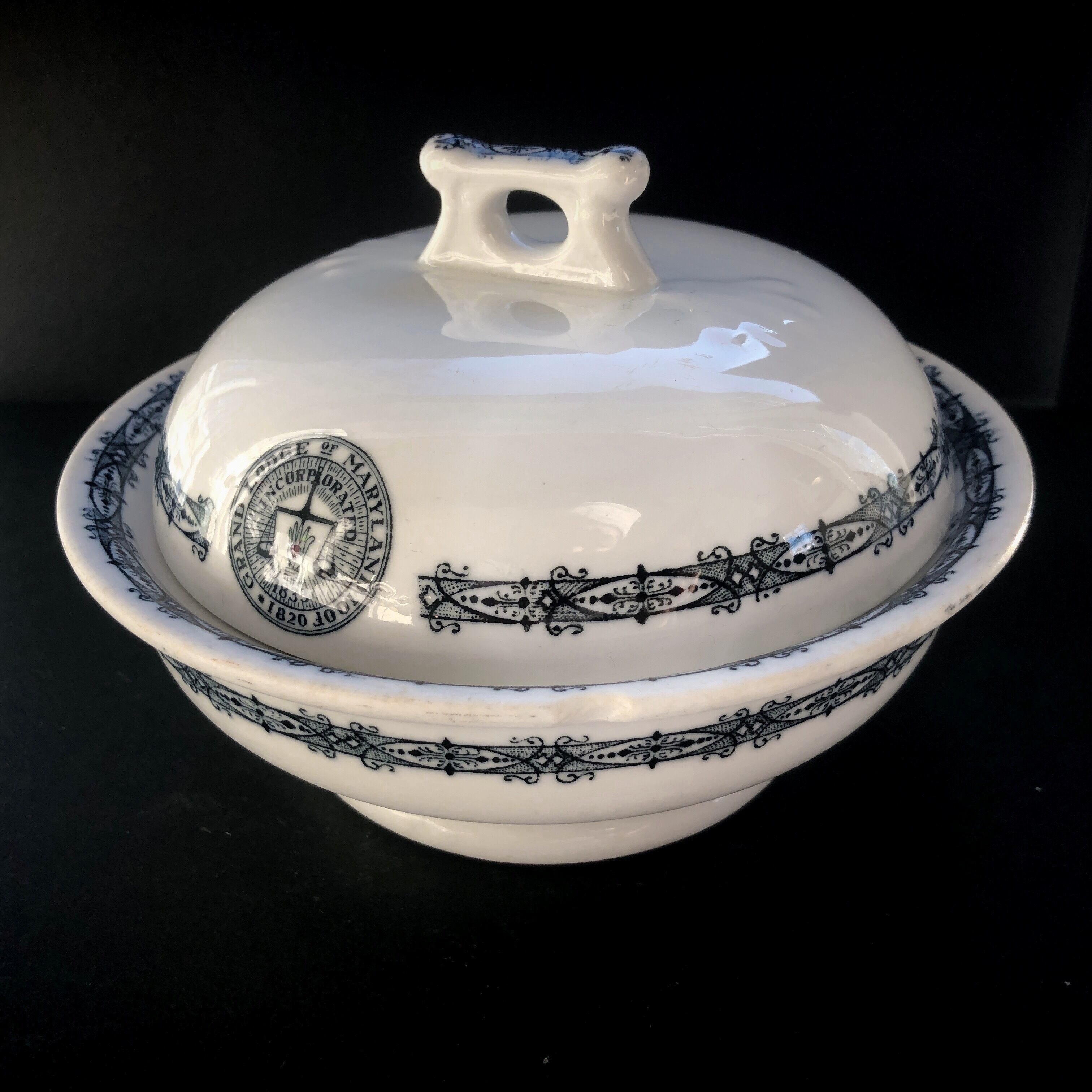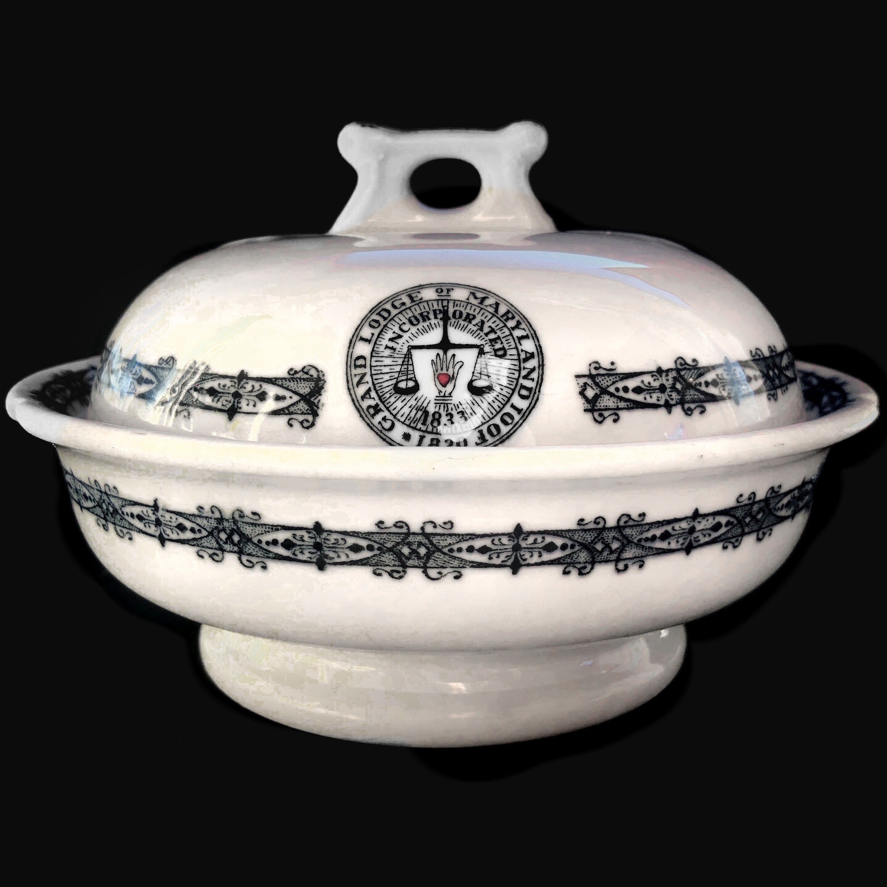 こちらの食器は、アメリカ合衆国、メリーランド州のフリーメイソングランドロッジで使用されたものです。シンボルには設立年や承認された年と思われる記載があり、正義や公正、真理などを象徴する天秤が描かれています。すっきりしたフォルムに濃いブルーの装飾を施した佇まいからは、静かで穏やかな中に理念を見失うことなく、自制心を重んじるメイソンの姿が垣間見えます。