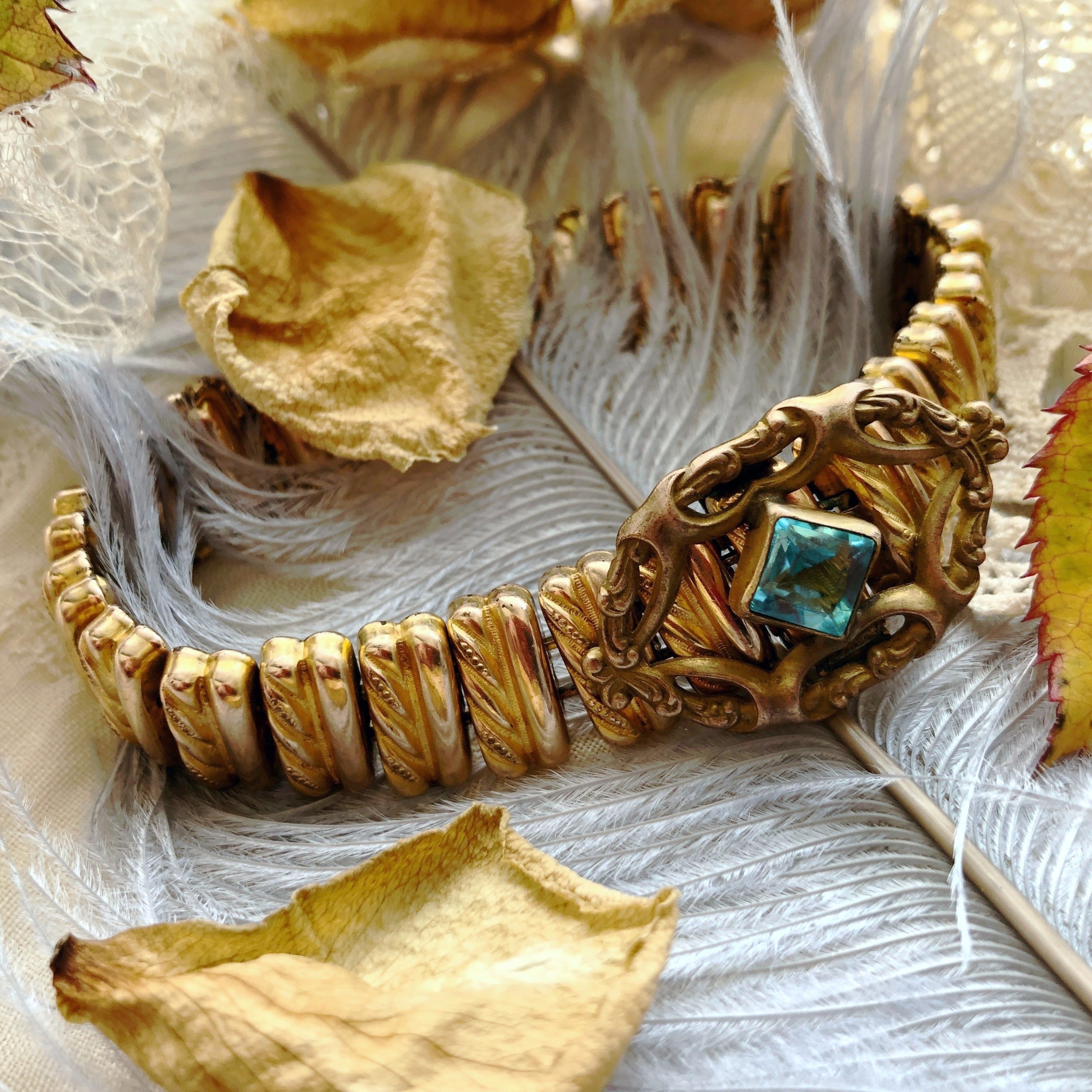 つや消しの金に透明感のある水色を合わせたブレスレットです。水色の一粒はペーストガラスで、水の精を思わせるような光を含んだ瑞々しい色味で、角度によってシルバーの煌めきを宿します。このペーストガラスは、宝石を模倣したいという強い思いから、透明度の高いガラスに巧みな研磨を施すことで生み出され、19世紀、ヴィクトリア朝にその技術はピークを迎えました。
