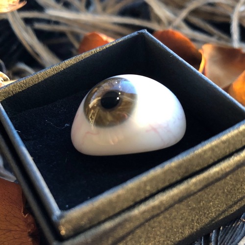 外縁は黒みを帯びた青、その内側にこげ茶、黄、白などの筋が複雑に踊ります。そして、その全ての色に黒々と闇の精霊が宿り、この表現は数多くの義眼の中でも本当にユニークです。仄暗くも静かに透き通る深遠な世界の美しさには、きっと心奪われることでしょう。