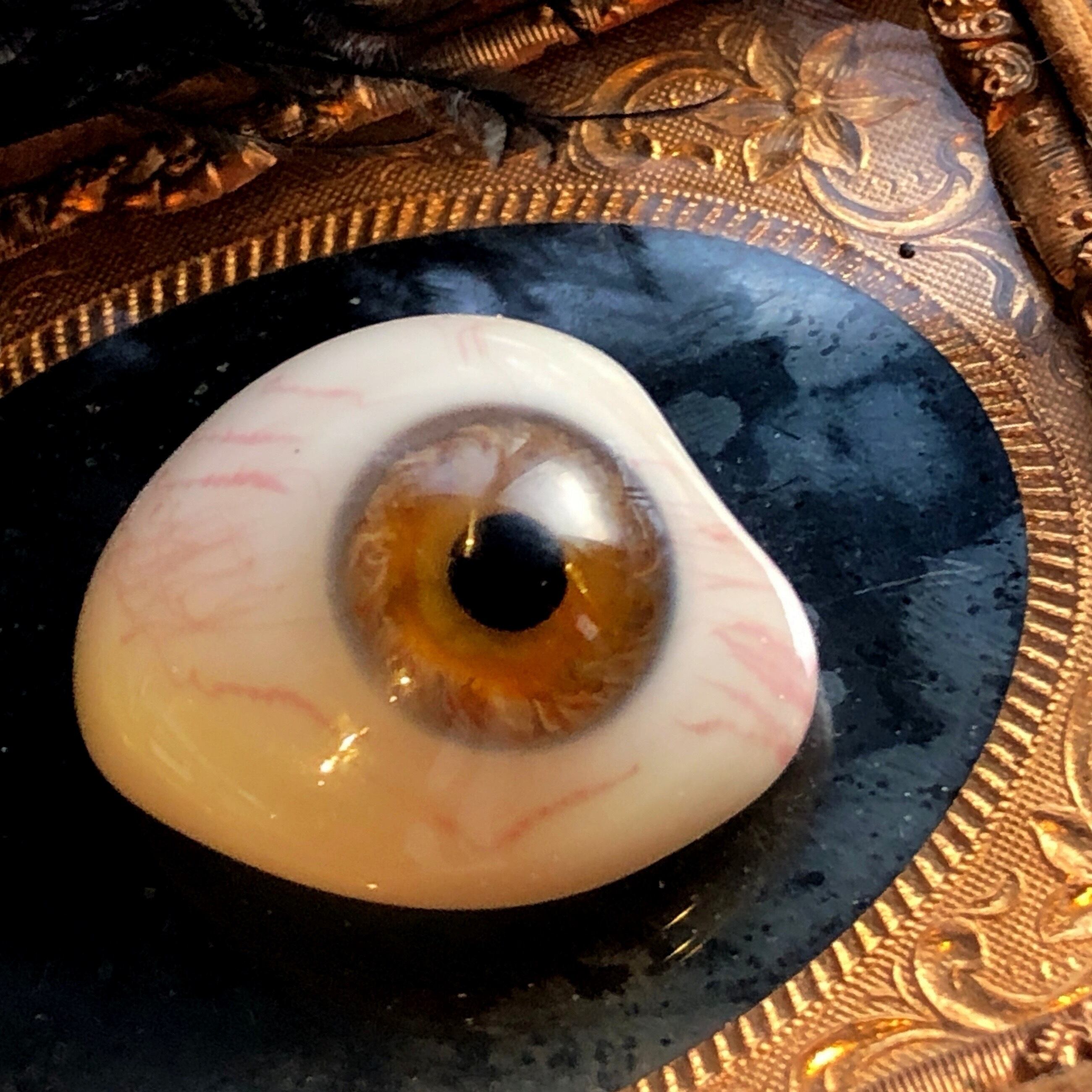 こちらのガラス義眼はドイツ、チューリンゲン州、ラウシャの "Theodor Müller-Hipper" の手によるもので、その商標にはチューリンゲン州の「最高品質認定」の記載があります。ラウシャは古くから優れたガラス工芸の町でしたが、19世紀にイタリアから義眼製作の技術が伝わり、19世紀の末までにはガラス義眼で有名になりました。今でもその技術を使って、カスタムのドールアイなどを製作しているそうです。