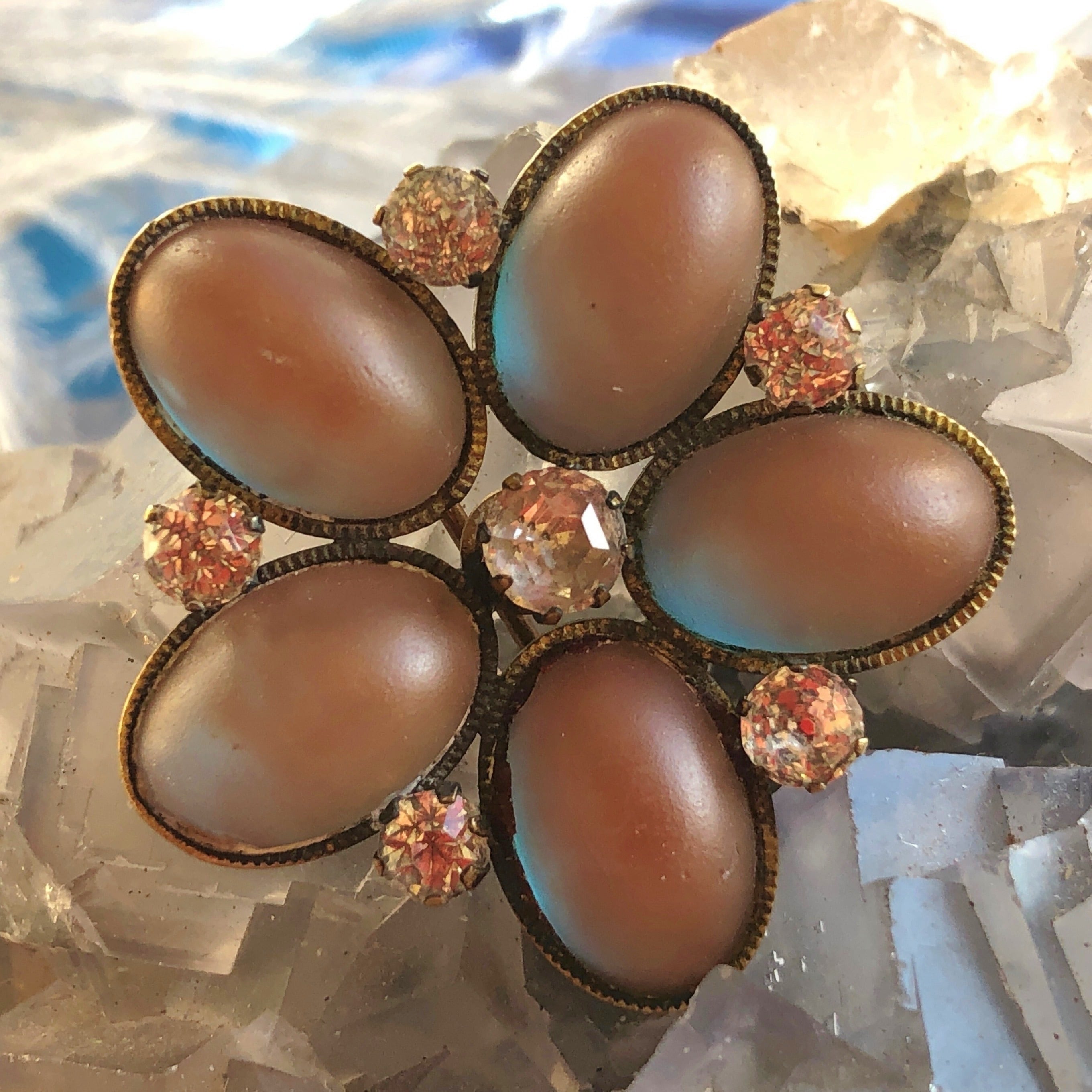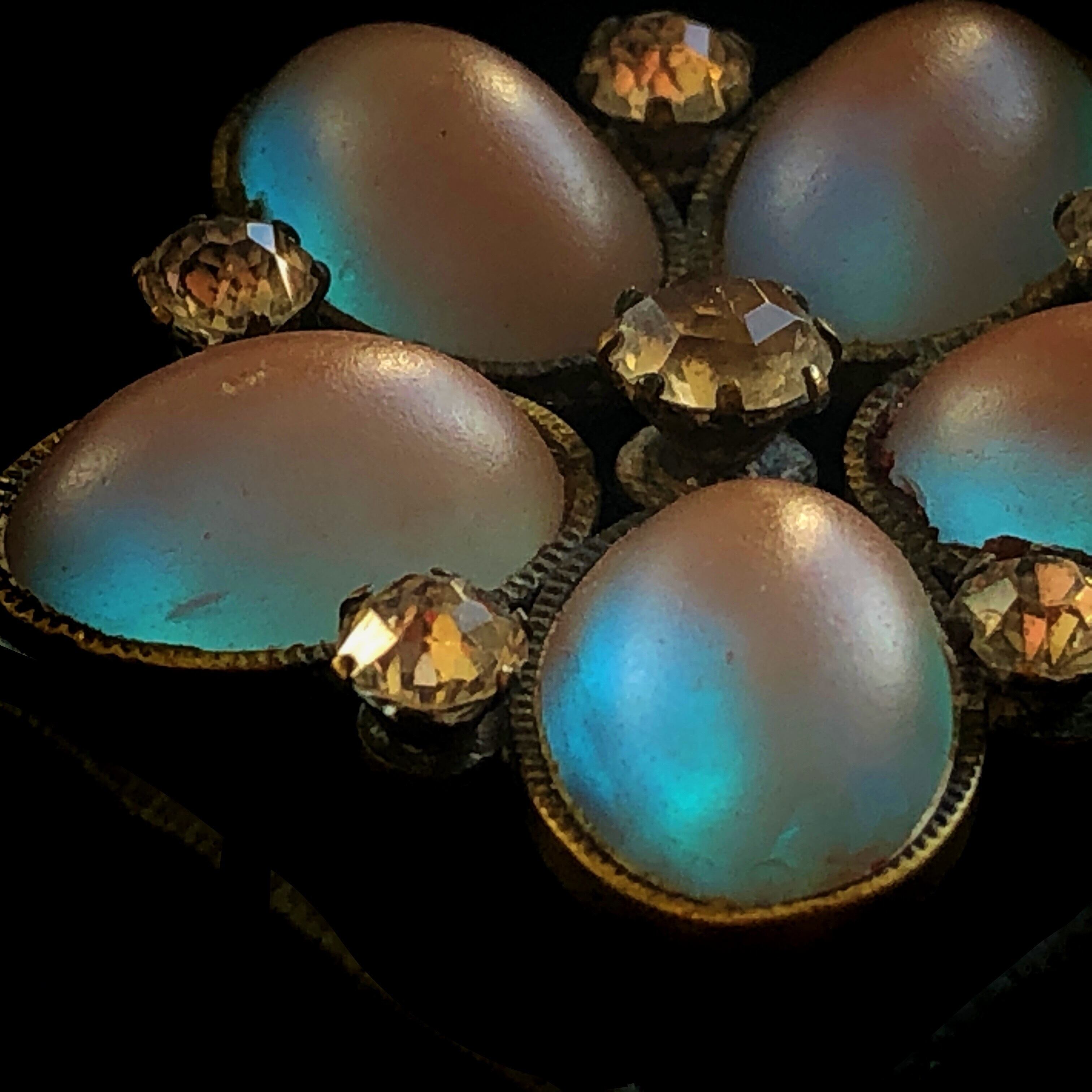 カボションカットのサフィレットが5つ置かれたブローチです。サフィレットグラスは19世紀の中頃からボヘミアで製作され、光線の加減で中に様々な色の光が浮かび上がる特徴を持っています。その製作は20世紀の初頭で途切れ、現在ではその正確な製法はわからなくなりました。理由としては、閉じられた工房でのみ製作され製法が門外不出であったというものの他、諸説がありますが、何れにしても現代では再現不可能な技術のひとつとされています。