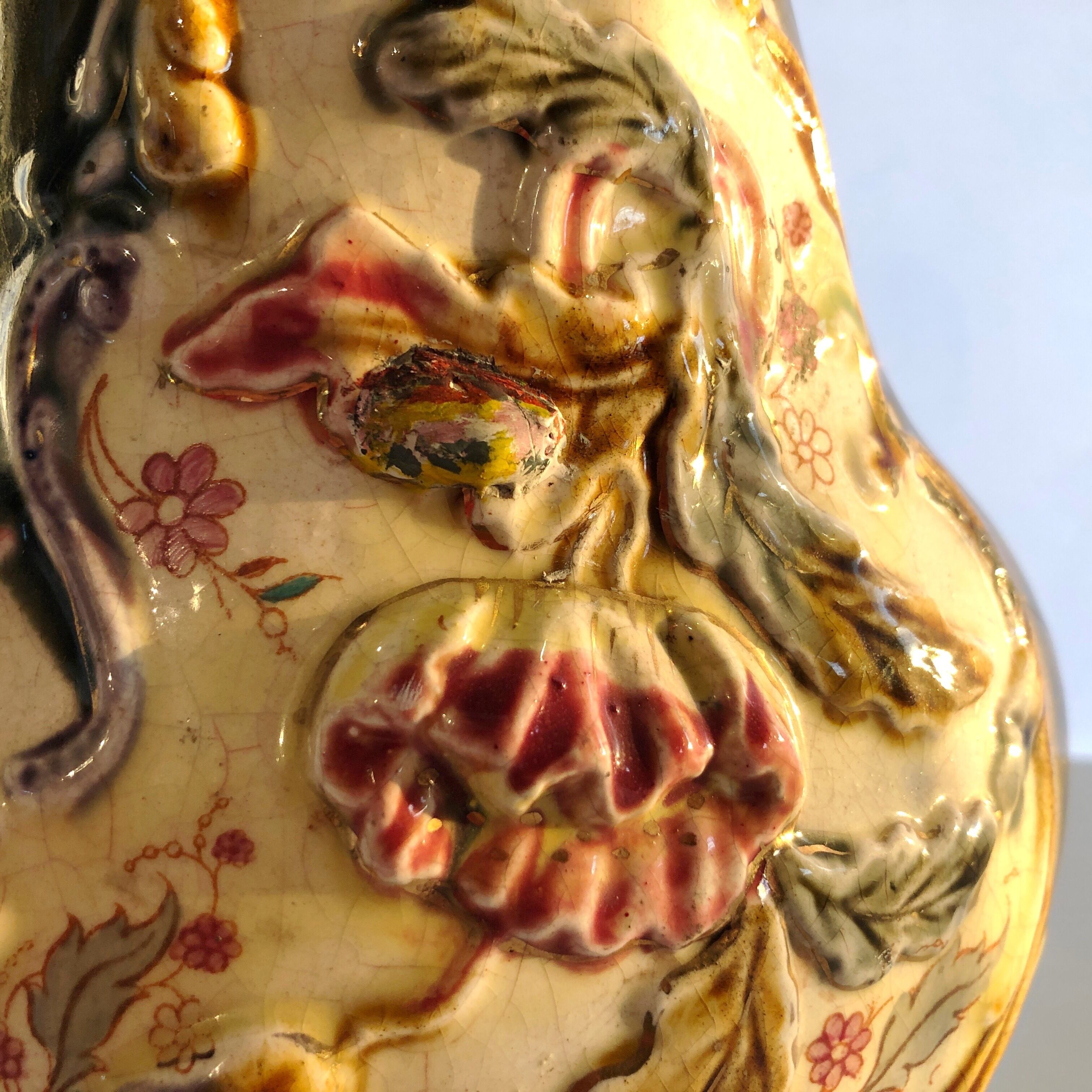 20世紀前半までのフランス製で、サイズは高さが最大約26センチ、横幅の最大が約15センチです。彩色された花の浮き彫りに欠けを修復し、そこに後から彩色したと思われる跡がありますが、これもこのお品特有の景色とご理解ください。