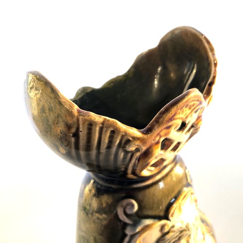 上部の造形は何でしょう。角のようでもありますが、そこに花を活けたら蕾が割れて花があふれたようになるかもしれません。土を巧みに使って大きく中央に浮き彫りにした花には複雑な色彩の彩色が施され、さらに深く立体感を増しています。生命の躍動感を感じさせながら落ち着いた色調ですので、活けた生花をより引き立てることでしょう。