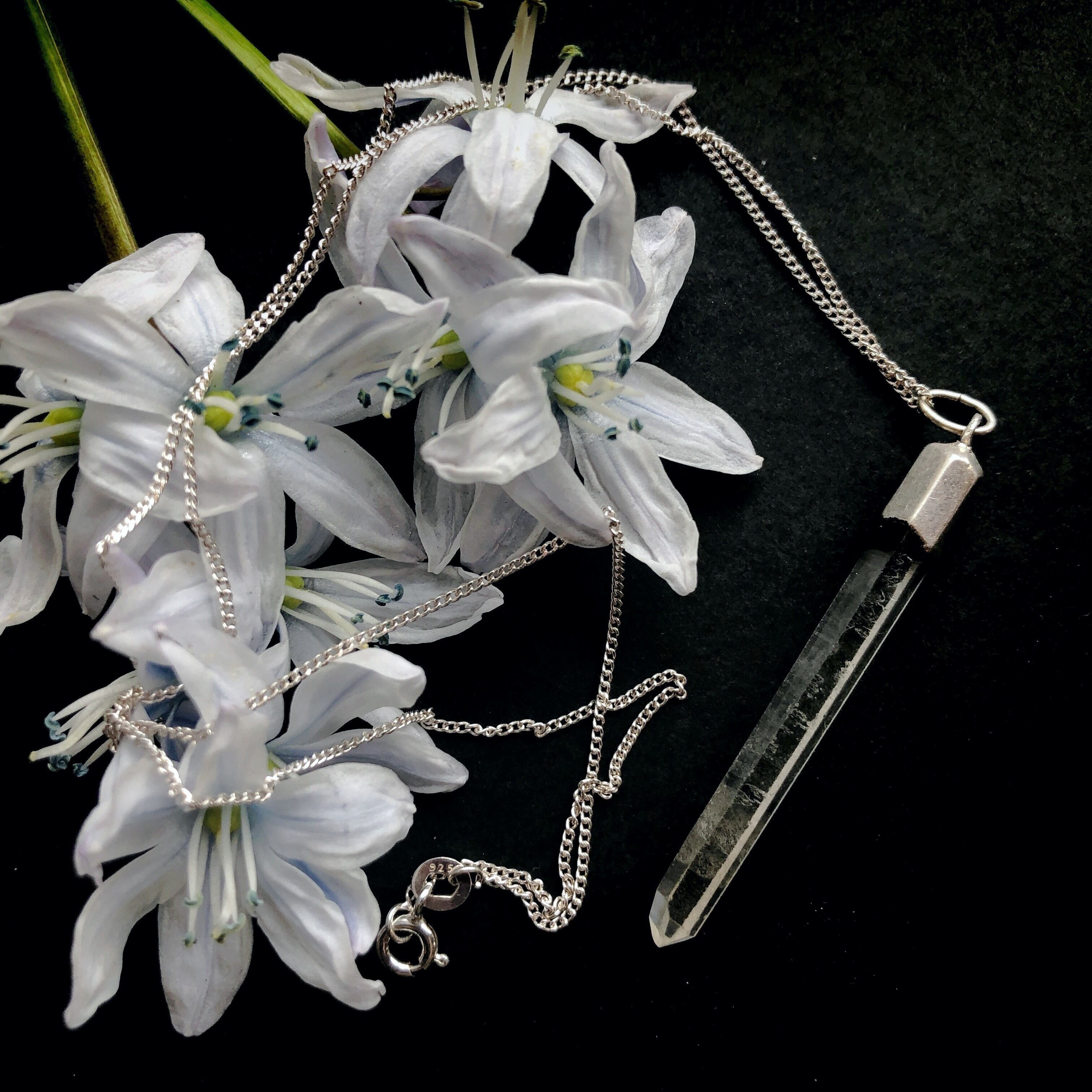 このロッククリスタルは6角柱の形にカットされていますが、それぞれの面が不均一に歪んだ造形で、各面に異なる模様が浮かび、天然石の面影を十分に残した造形と質感になっています。掘り出された水晶をそのまま身につけたような、ちょっと神秘的な雰囲気のお品です。