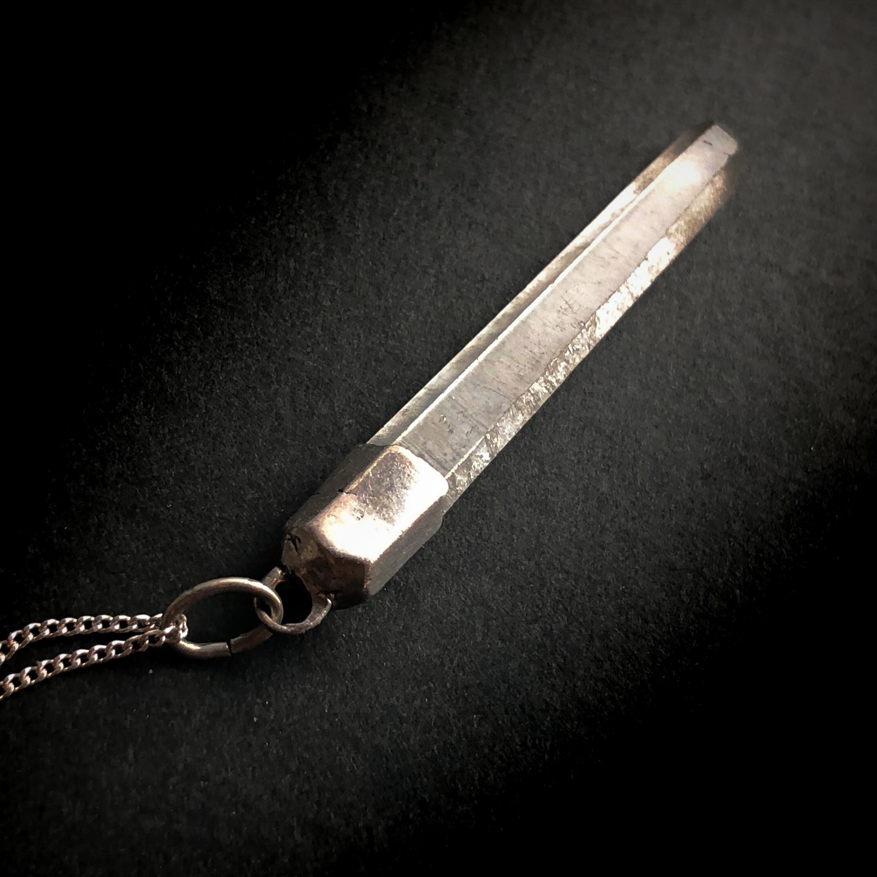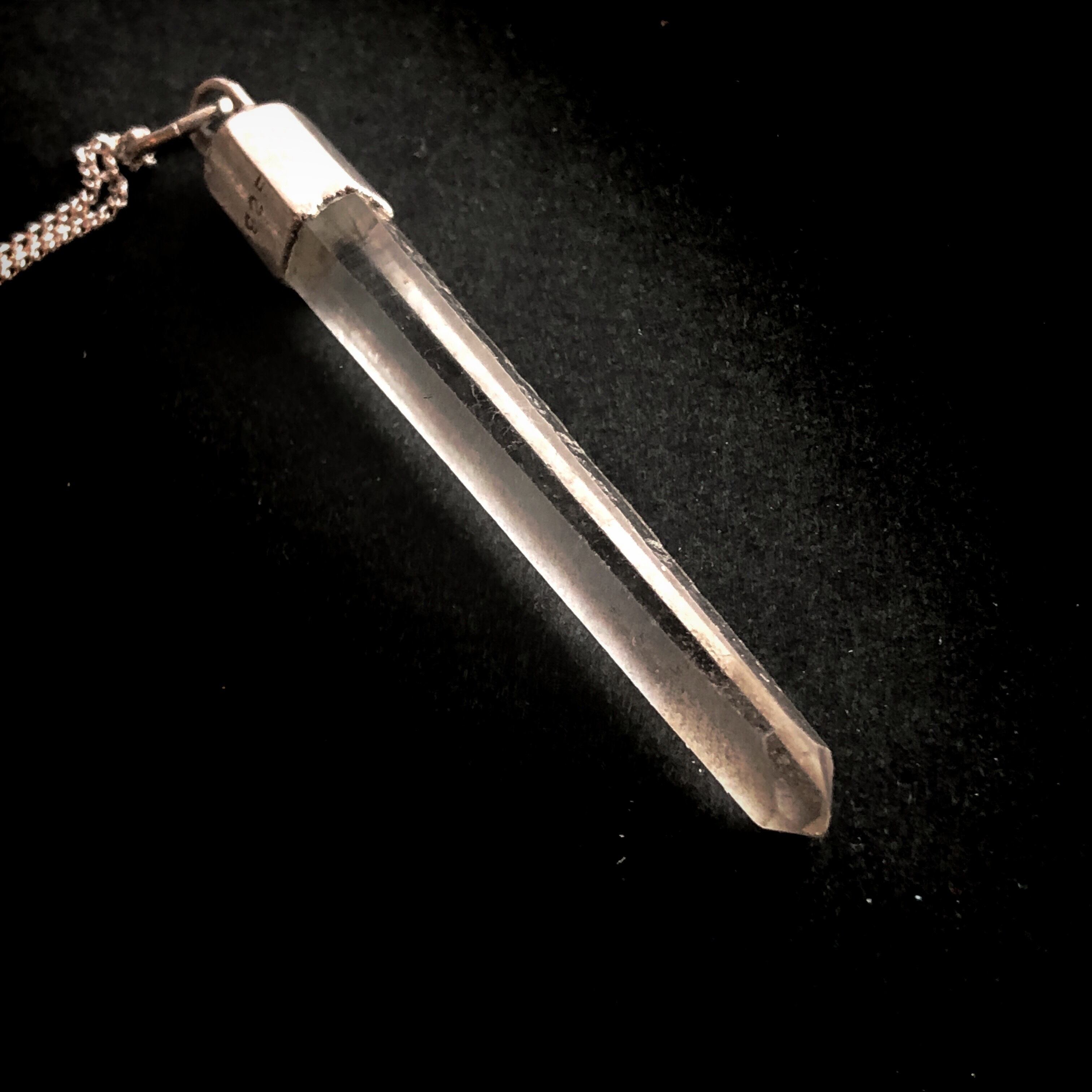 クリアな水晶のペンダントです。こちらはペンデュラムでしょう。ペンデュラムとは元々は「振り子」という意味ですが、かつて水脈や鉱脈を探す際に用いられ、さらに探し求める場所を指し示す占いの道具となりました。その動きは持っている人の守護霊によるとも潜在意識を反映するとも言われており、自らの心の声に耳を傾ける際に使われるものと考えてよいでしょう。