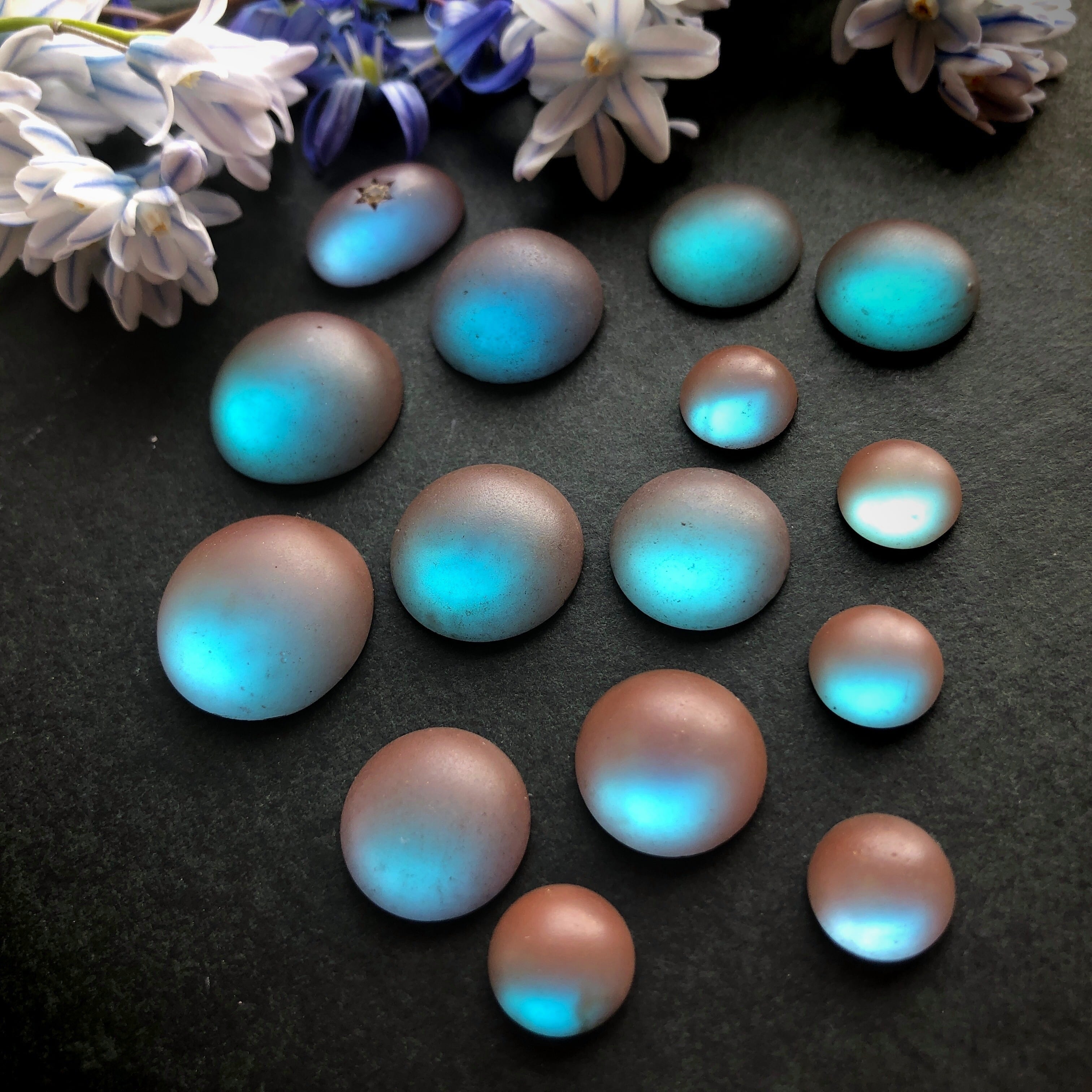 カボションカットを施された円形のサフィレットのルースです。光を浴びるとローズグレーの地に鮮やかなターコイズブルーの光を宿します。