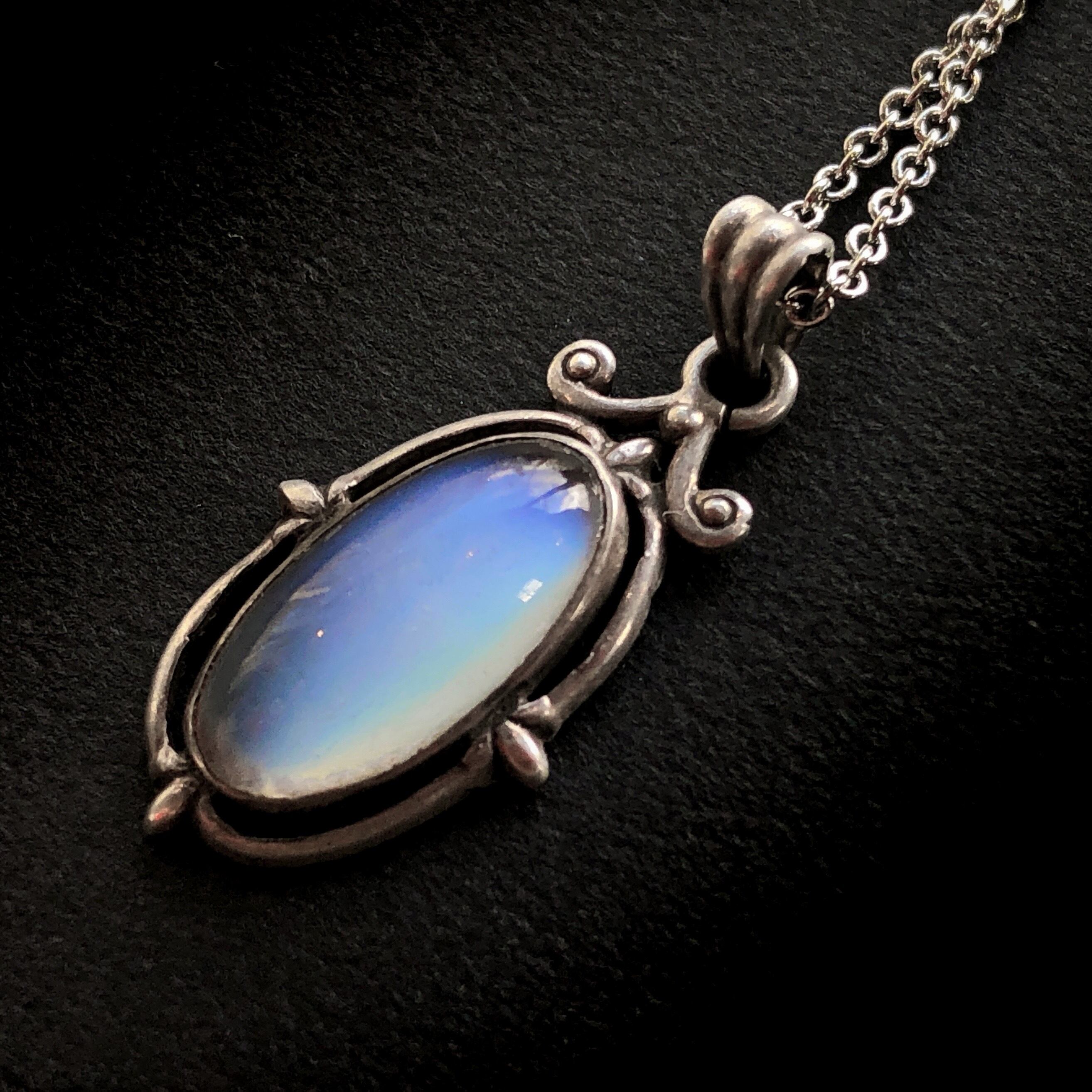 艶やかなカボションカットにほんのりと浮かんだクールなライトブルーが光の加減で濃く、薄く表情を変え、縦に走る光の筋が動きに合わせて素早く移動し、また、塊の内側が光で満たされる瞬間もあります。売主は「真珠貝の光沢、猫目石やムーンストーンの質感」と言っていましたが、このお品をよく表しているのではと思います。