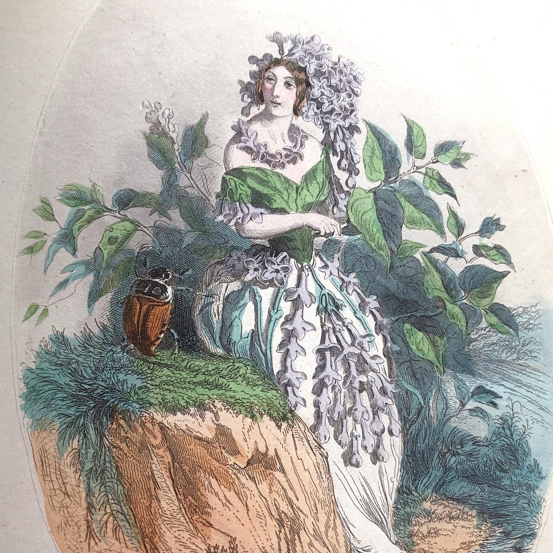 グランヴィルは19世紀の挿絵画家です。人を動物に変身させたりする風刺のきいた画風でしたが、実生活は決して幸福とは言えず、そのせいもあったのでしょうか、しだいに幻想的な絵の世界へと入り込んで行きます。こちらの "FLEURS ANIMEES"「花の幻想」はそうした彼の晩年に描かれた、花々に人の姿を見るという絵のシリーズです。描かれた絵に友人のタクシル・ドロールが物語を添えました。絵に物語を書くという、この挿絵と物語が逆転した逸話からも、彼の絵がいかに物語性に富んでいるかがわかります。そして、分冊配本が始まった1847年の3月に、グランヴィルは43歳の生涯を終えています。