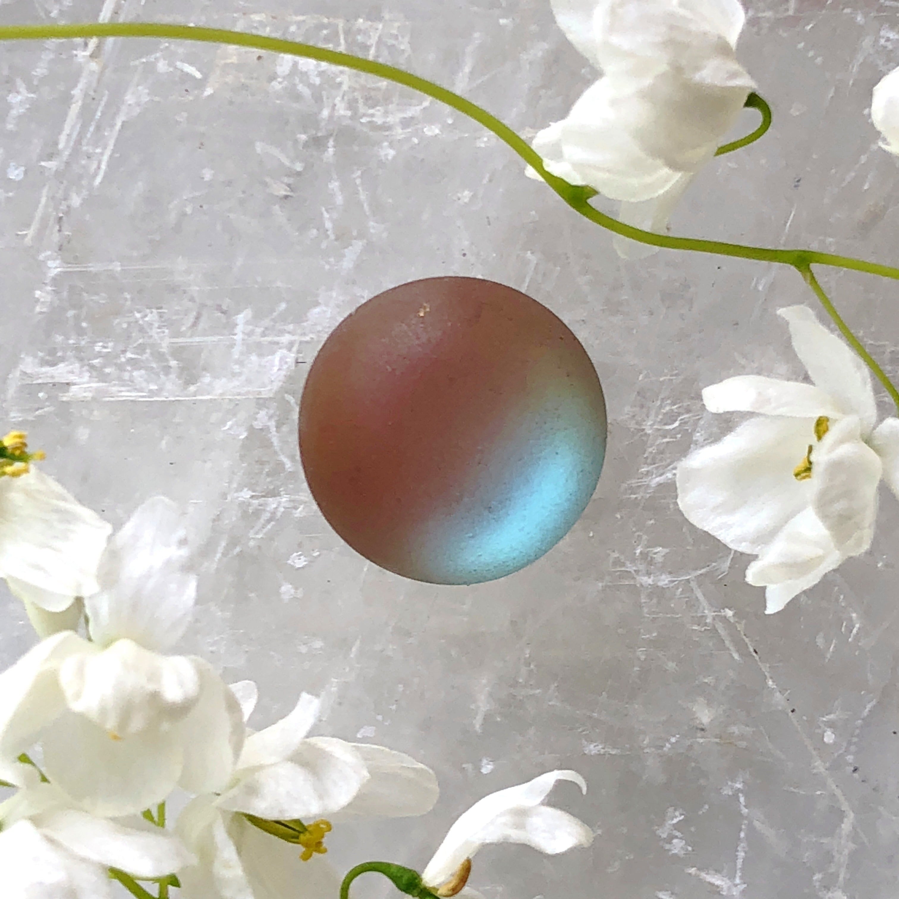 カボションカットを施された円形のサフィレットのルースです。光を浴びるとローズグレーの地に鮮やかな水色の光を宿します。