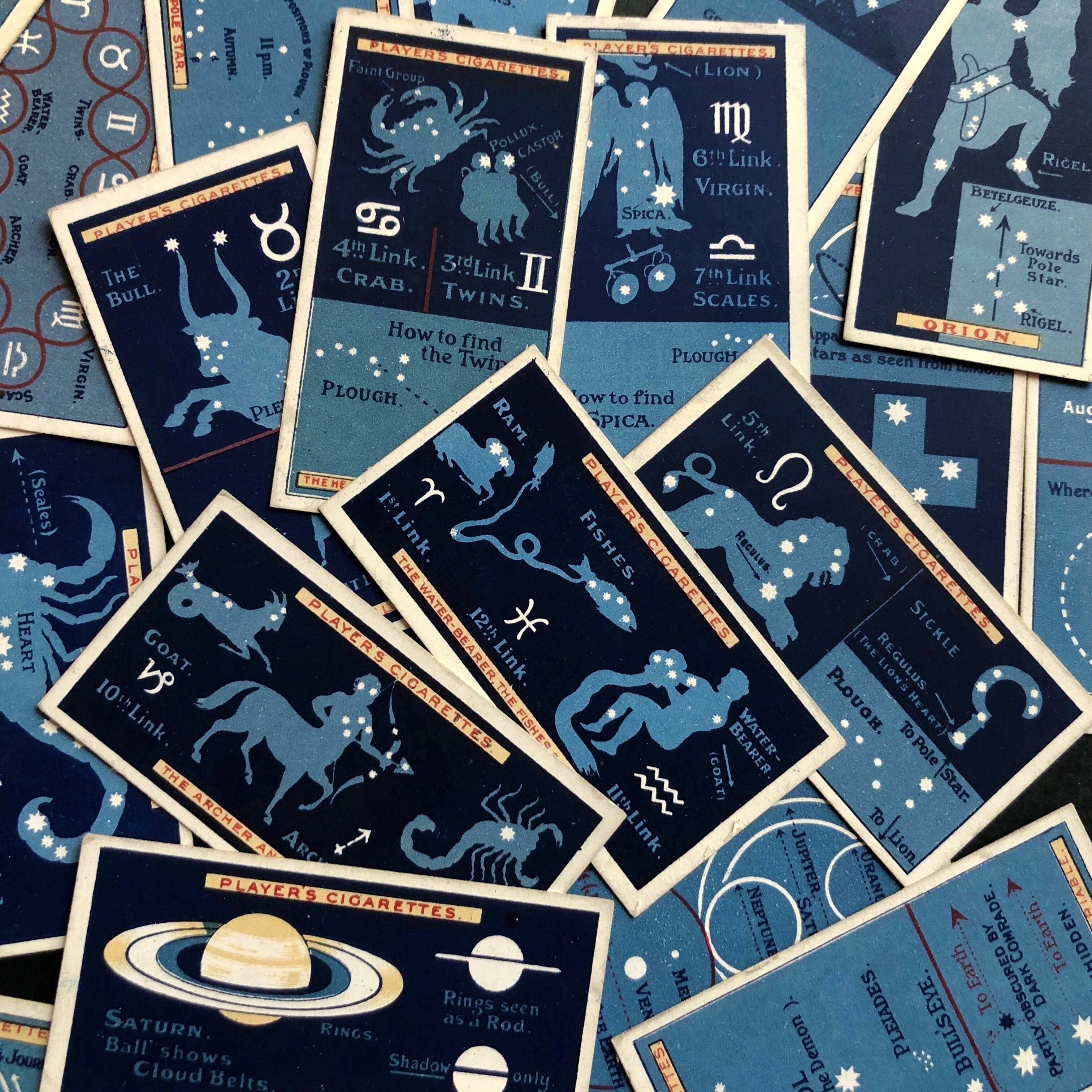 1916年、英国のタバコのおまけに付けられた天文カード "THOSE PEARLS OF HEAVEN"「天の真珠」シリーズを、25枚全種類揃いでお届けします。1916年といえば第一次世界大戦中ですが、そんな時におまけを付けてタバコの販促をしていたなんて、ちょっと驚きますね。シガレットカードの天文シリーズは他にもありますが、星座12宮のカードが含まれているのはこのシリーズだけです。青を基調にしたクールなデザインが素敵で、裏には解説がついてます。
