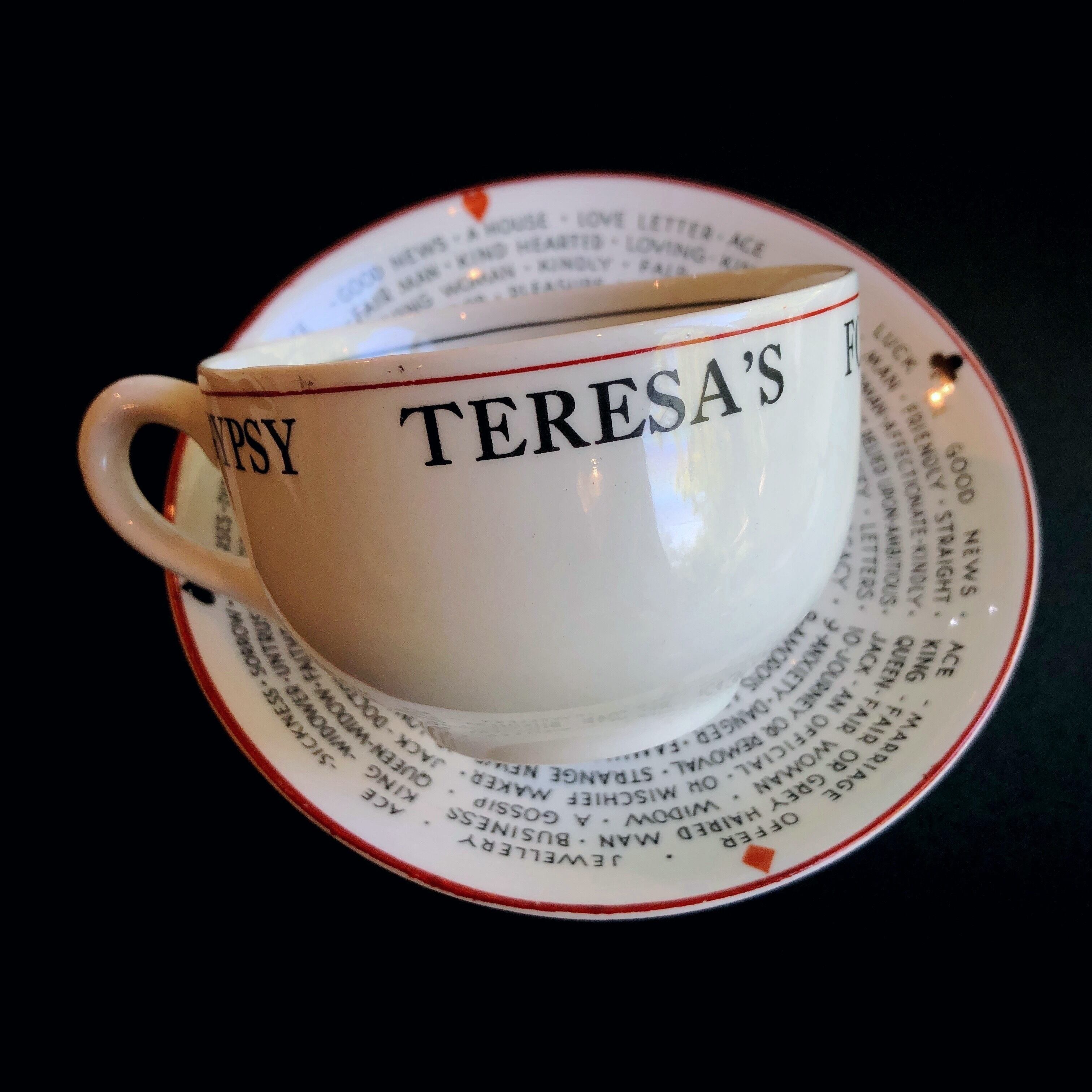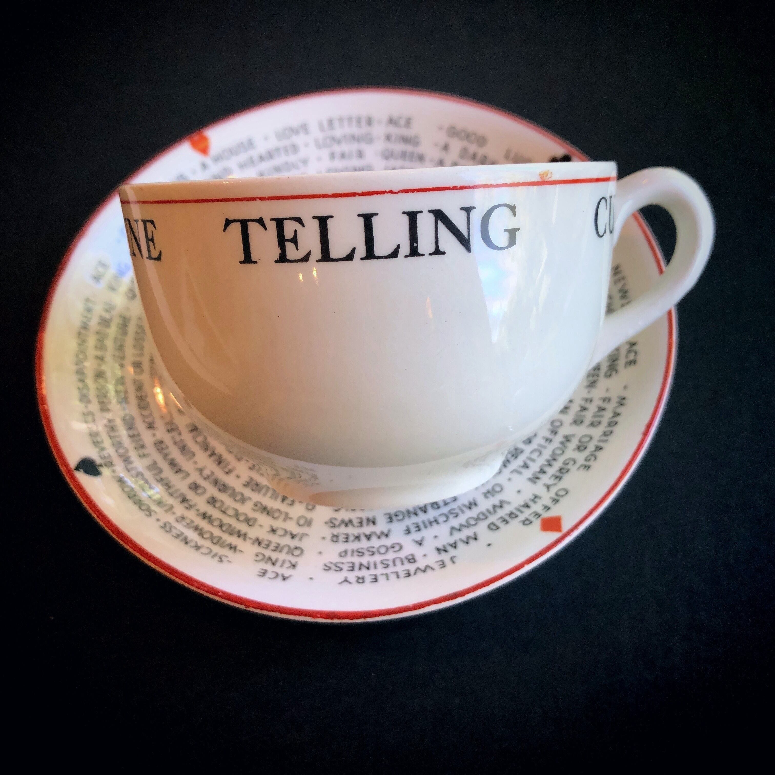 ジプシーテレサの占いカップで、トランプ柄の模様とカラーリングは深い意味を持った占いカップならではのものです。ティーカップの底に残る茶葉でその日の運勢を占うもので、受け皿には各カードの意味も書いてあります。この占いは1920年〜30年代、アール・デコの時代にイギリスで流行しました。20世紀の2つの大きな世界大戦の狭間でひと時華やいだ時代、きっとお茶席での会話も弾んだ事でしょう。