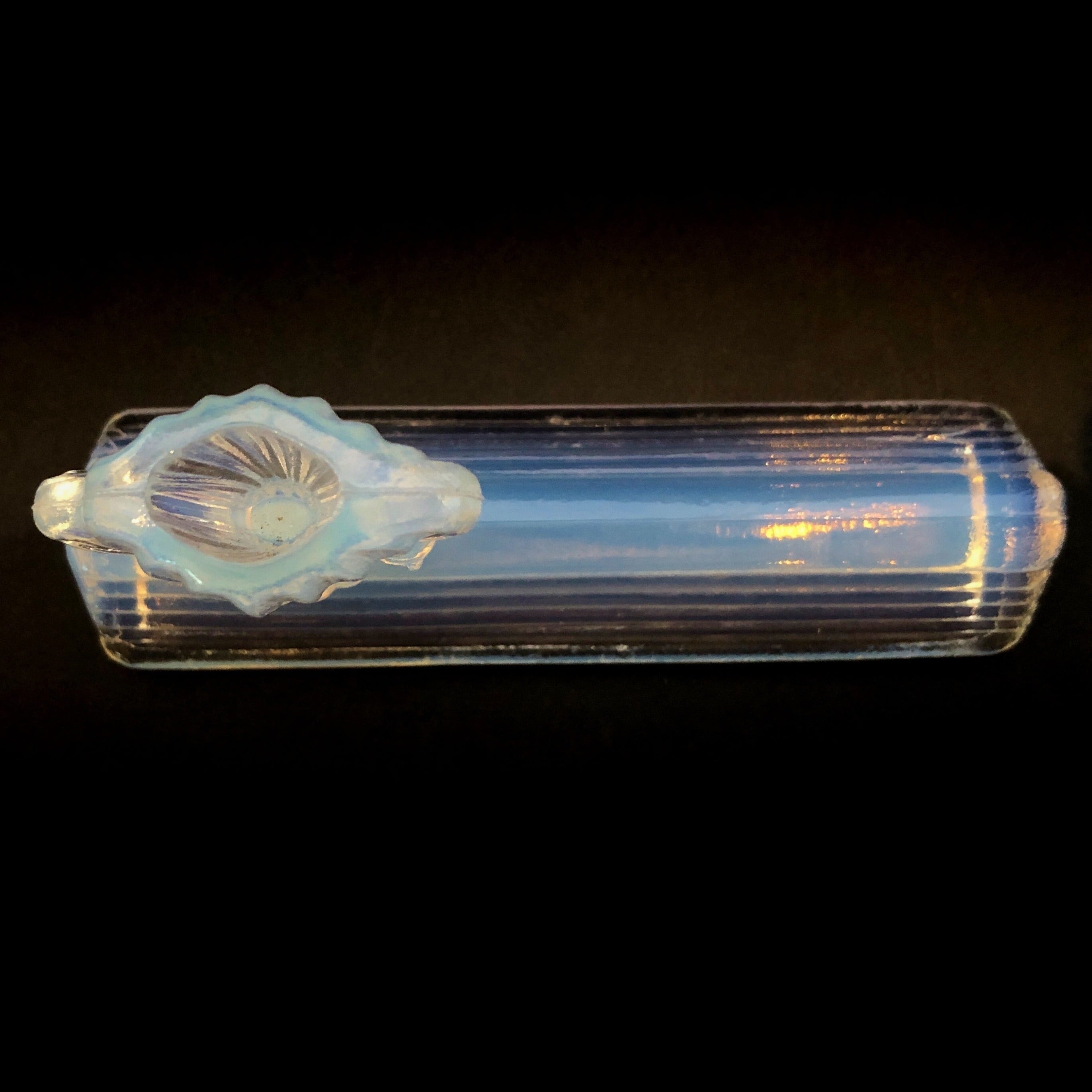 オパールセントガラスのフォークレストです。オパールセントガラスはガラスらしからぬ柔らかな質感に青白い佇まいで、光を浴びるとレモン色やアプリコットの遊色を浮かべる特徴があります。