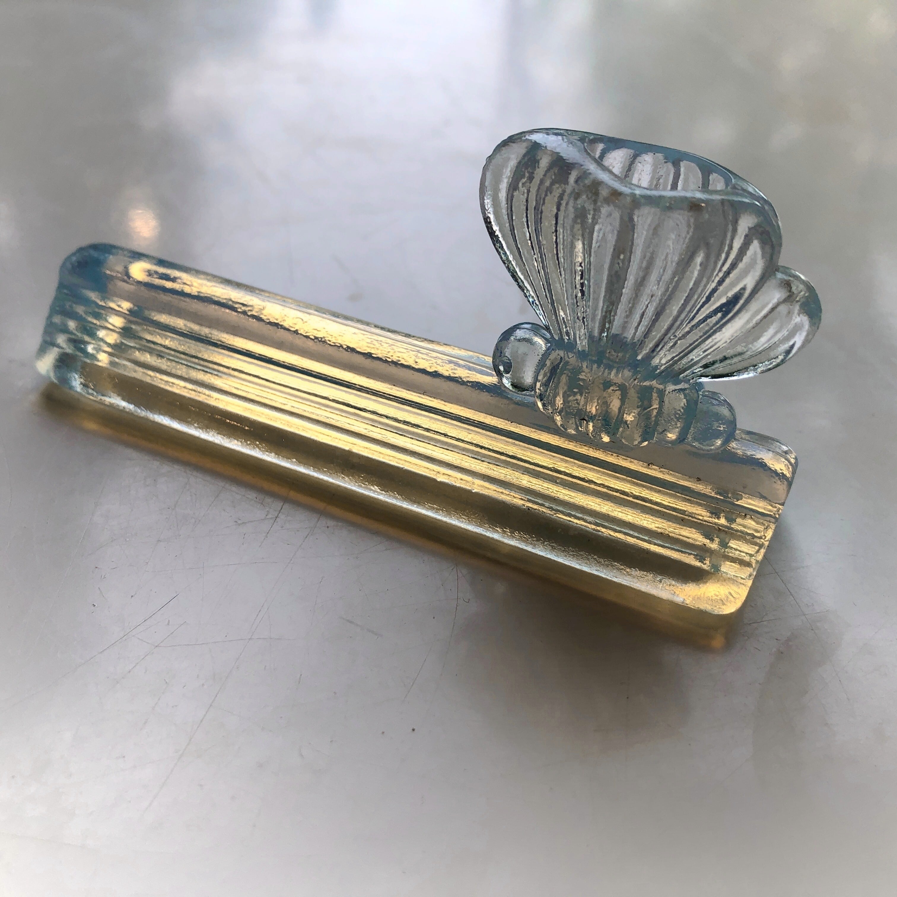 フランス語では、「ナイフ置き」などとも言い、要するにカトラリーを置くものですが、デスクトップでペン置きやペーパーウエイトなどにしてもよいですね。少しレトロな雰囲気が漂うアール・デコスタイルのガラスの文具となります。