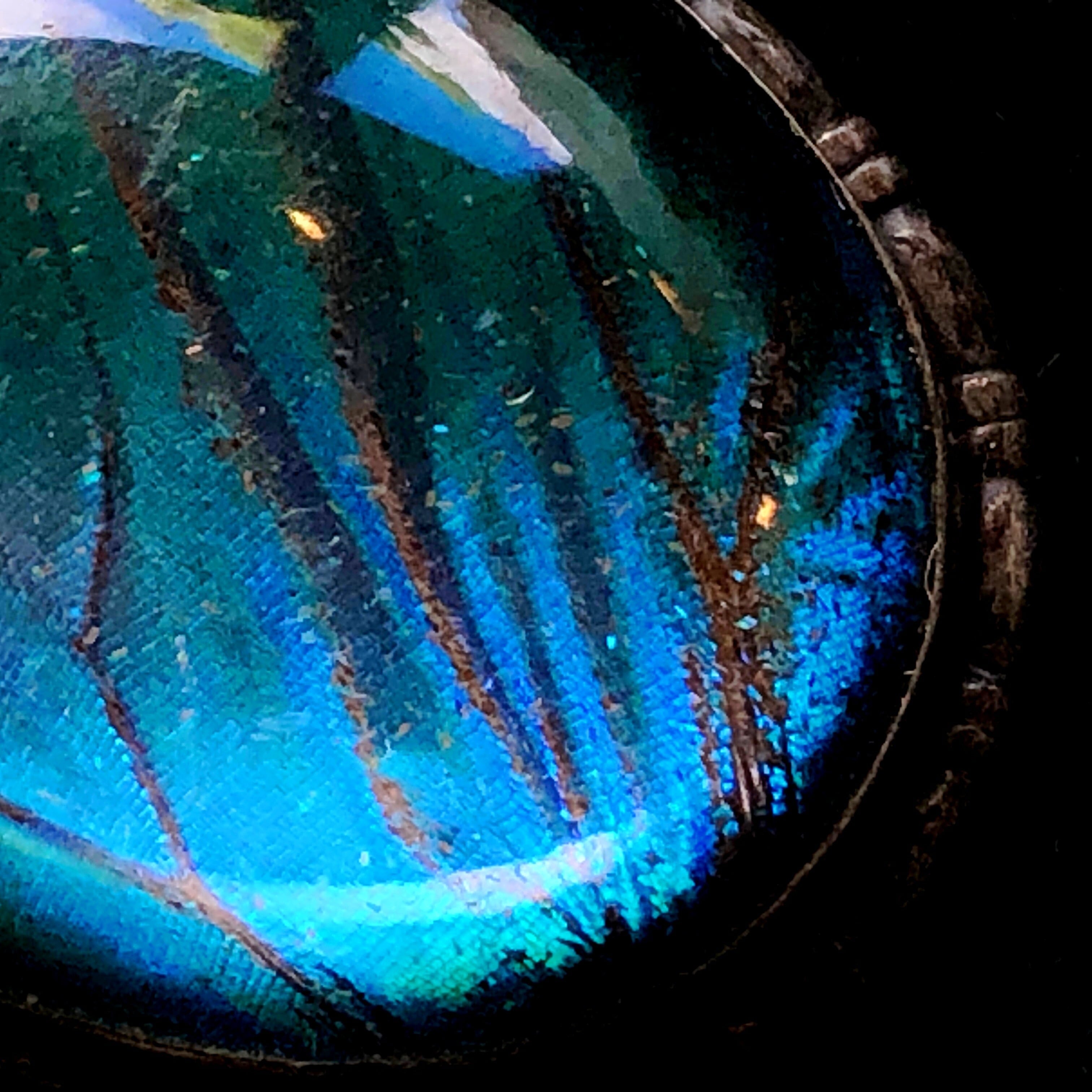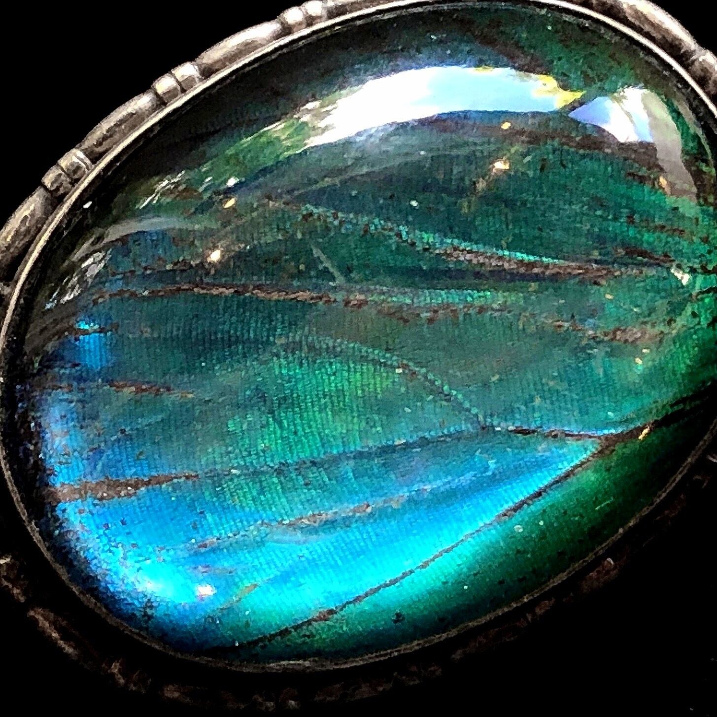楕円形のモルフォ蝶のブローチです。収められた天然の蝶の羽は光の具合で様々な表情を見せますが、こちらのお品はわずかに緑がかって煌めく薄い青の美しさに目を奪われます。角度によって、それが濃い青へ、さらに紺が次第に黒みを帯びて光から陰の世界へと移っていきます。
