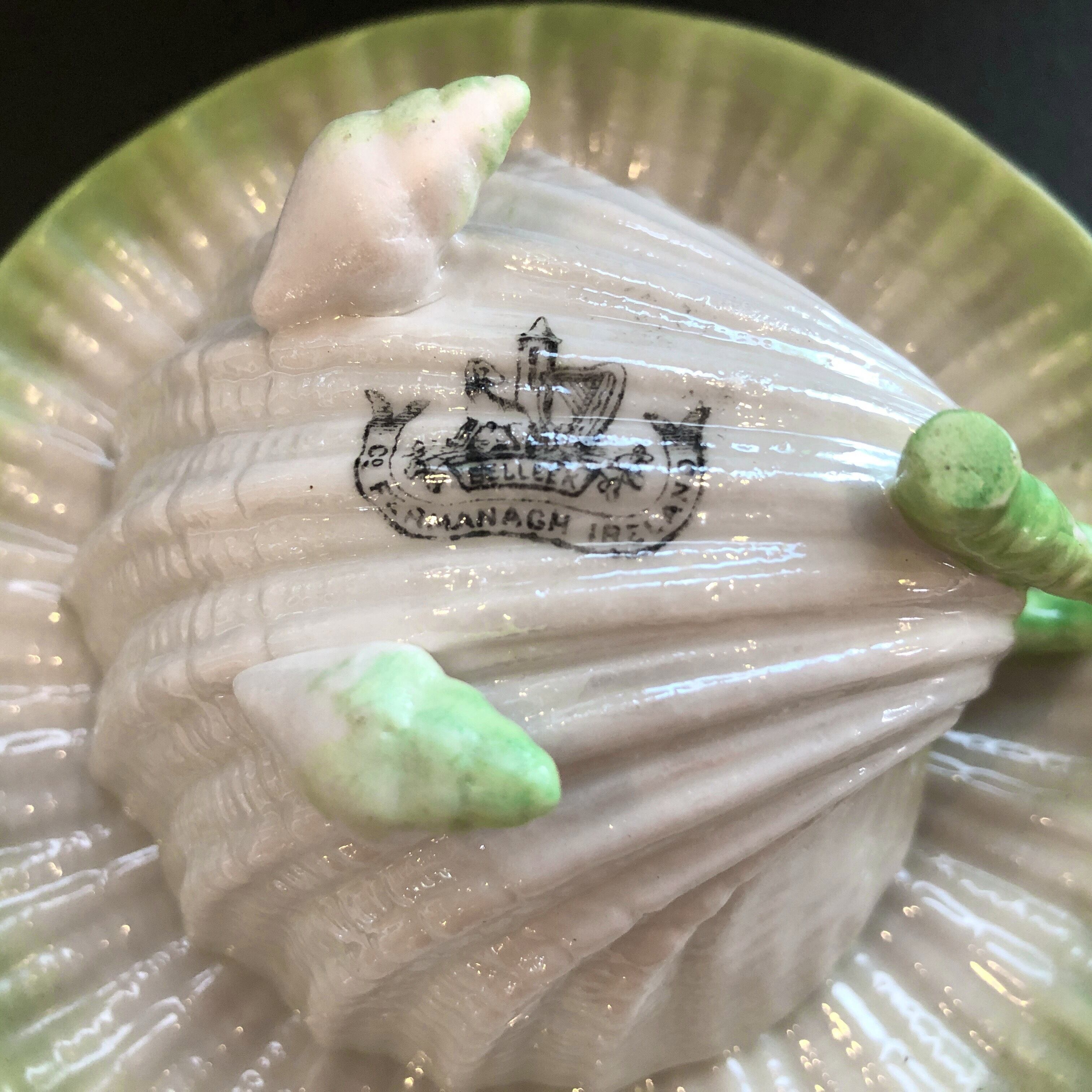 アイルランド、ベリーク窯、ネプチューンシリーズのカップ&ソーサーで、こちらは縁がグリーンになっているタイプです。ポーセリンマークは創業から2番目のブラックマークで、1891年から1926年に製作されたものです。ネプチューンの名前にふさわしく、全体が貝、脚に巻貝、持ち手がサンゴの意匠はどこから見ても美しく、特にブラックマークは生地が薄く軽く、羽のように繊細です。