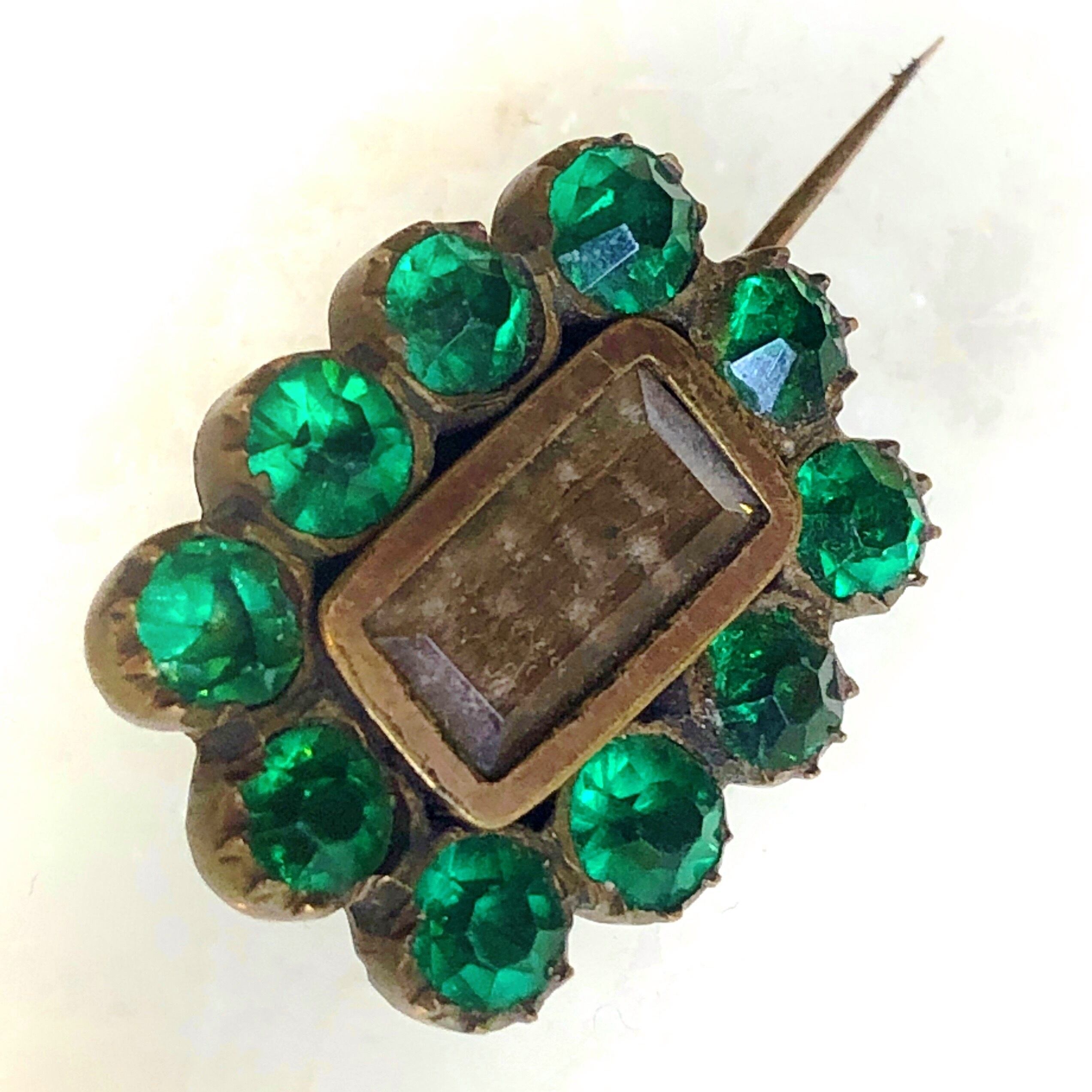 このブローチは、艶やかな亜麻色の髪が編み込まれています。周囲に置かれたペーストガラスは落ち着いた深いグリーンを湛え、綺麗にカットされた粒が角度によって瑞々しく光を宿します。静かな雰囲気の中にもエレガントな美しさをまとい、ひょっとしたらこの毛髪の持ち主は、実際にこういう雰囲気の魅力的な女性だったのかもしれません。