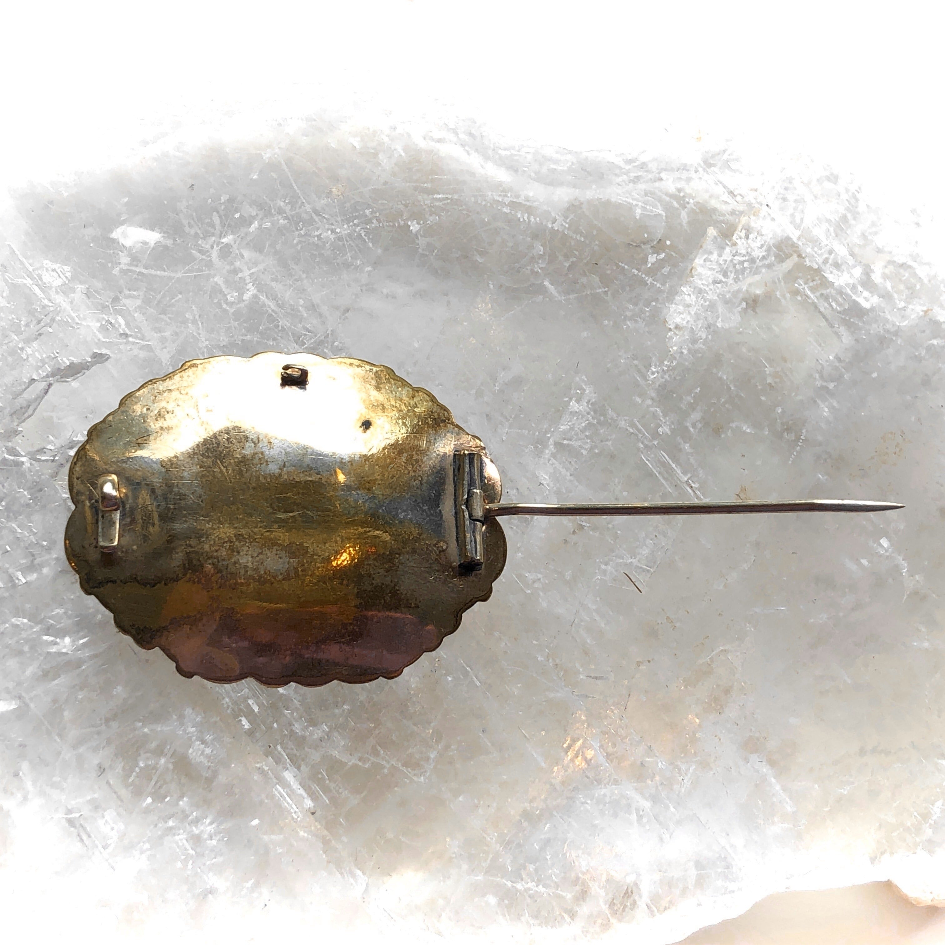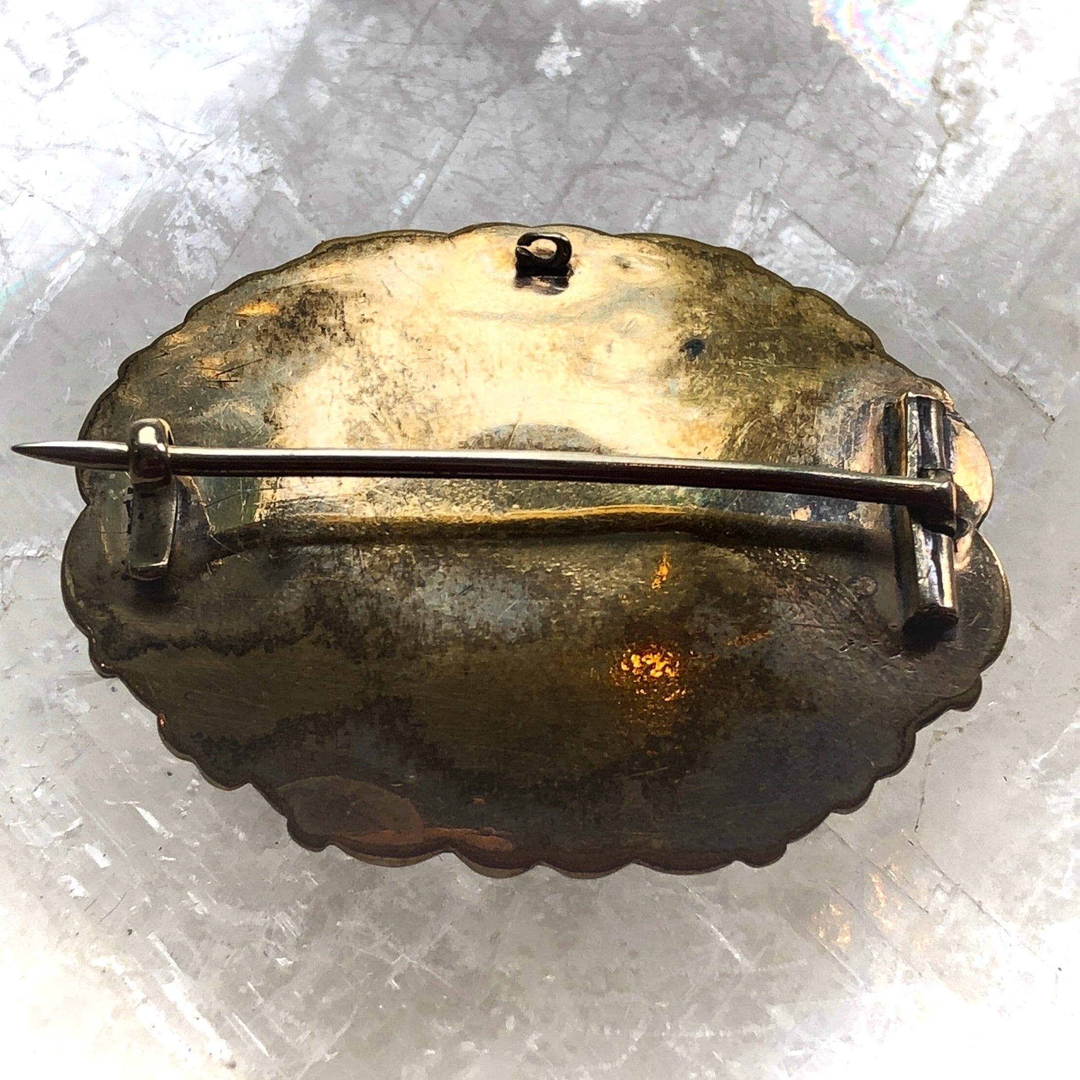 周囲には黒エナメルに金文字で「in memory of」「~を追悼して/~の記憶の限り」とあります。曲線を組み合わせた縁取りの盛り上がりも見事で、静かな追悼の気持ちとともに荘厳さを感じさせます。そして何より、毛髪の丁寧な細工も含めて、このような美しい形見を作り出した熱意が素晴らしいと思います。裏には留金と丸カンがついていてブローチにもペンダントにもなります。