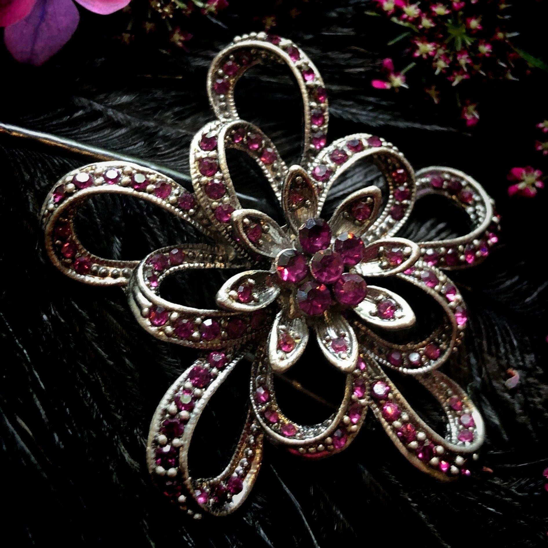 瑞々しい葡萄色のガラスは綺麗にカットされ、光の角度によってある時は鋭く、またある時は瑞々しく輝きを放ちます。この粒は無数に配置されていますので、ブローチの動きによって煌めきも移動し、また、あちこちで同時に異なる光を宿します。
