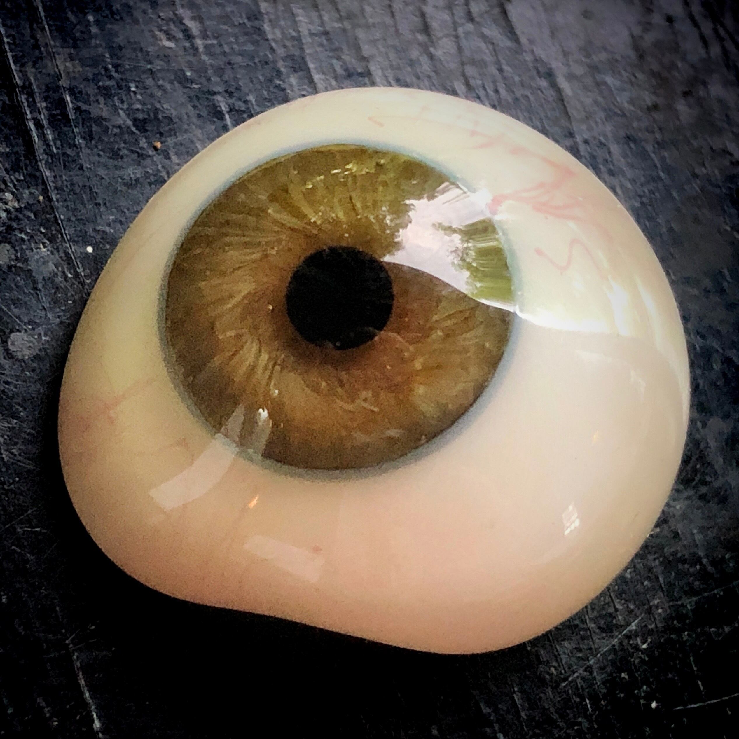 黒目からアンバーが滲み出し、くすんだ茶色へと移るのですが、そこにほのかなグリーンが靄のように漂っている気がするのです。それはごく薄い青、白、黄の繊細な筋が渦を巻いて踊っているからなのでしょう。それが澄んだガラスの中で溶け合って光の靄のように立つのかもしれません。このように澄み切ったガラスの塊の中で、光と色彩が戯れているような曖昧で微妙なニュアンスが、この義眼の大きな特徴です。