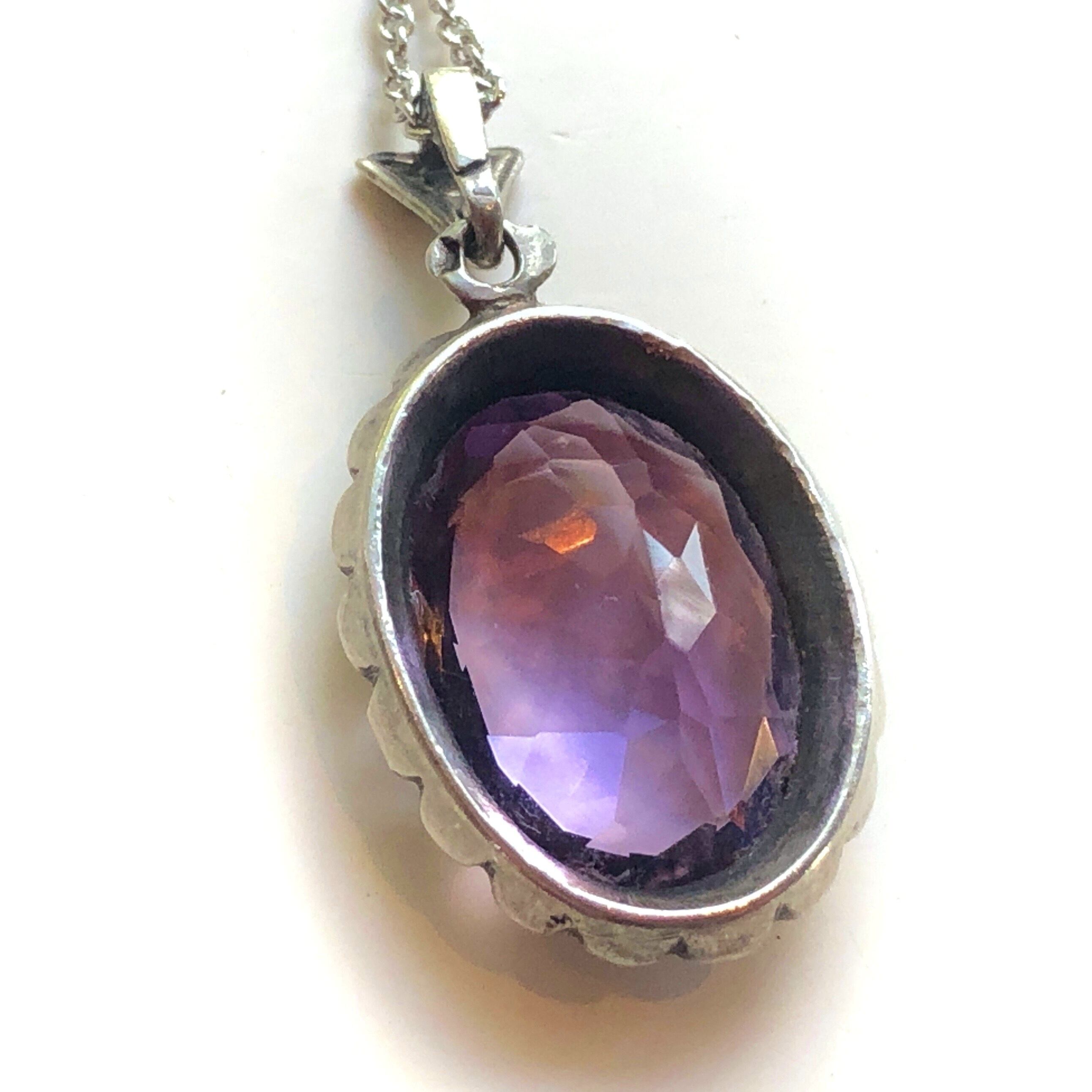 美しいひと粒のアメシストのペンダントです。綺麗にカットされた澄みきった石が銀の煌めきや淡い紫を帯びた光りを放ち、それが角度によってぐっと黒みを増した紫を現します。その清らかな印象から一転ダークに変わる表情のコントラストに魅せられてしまいます。