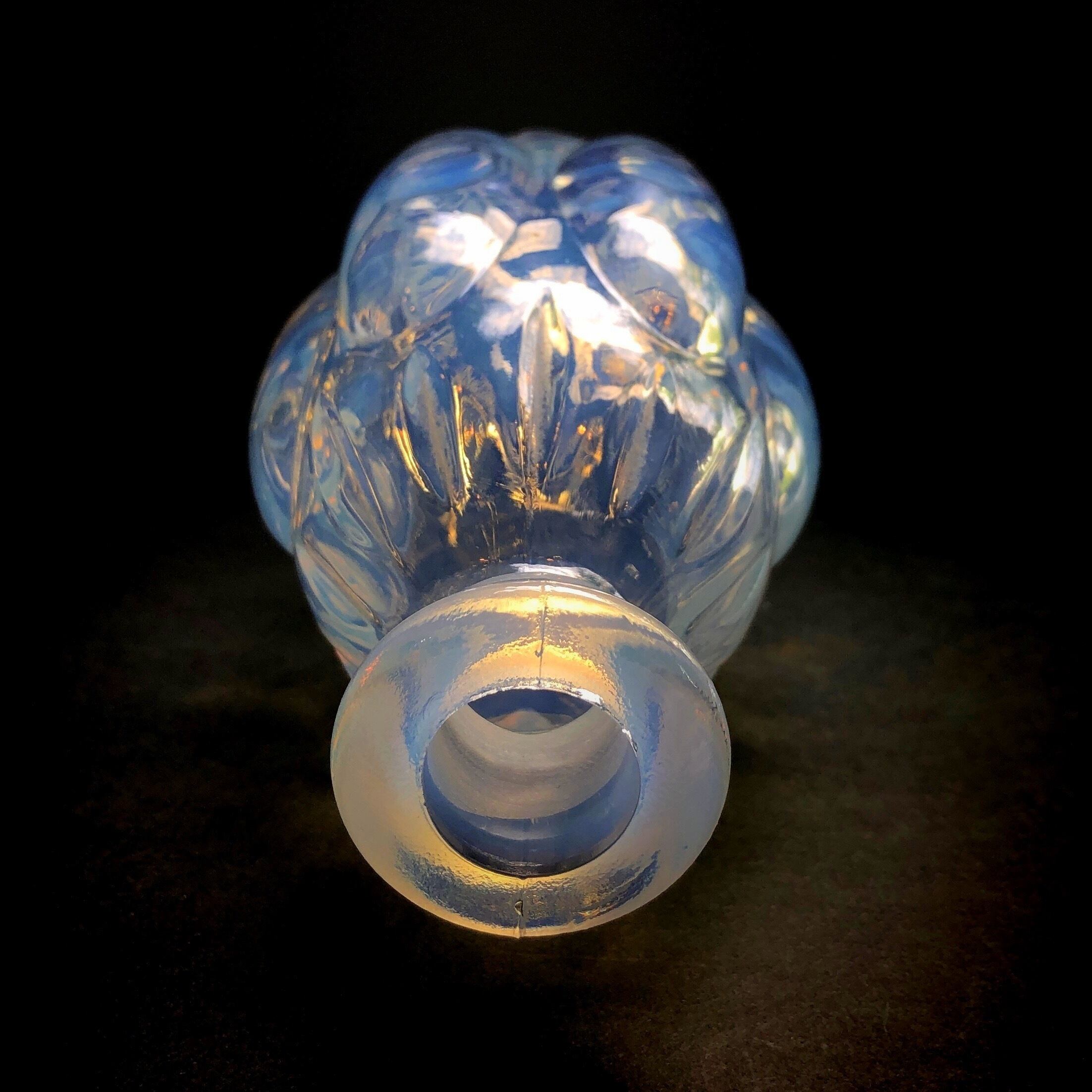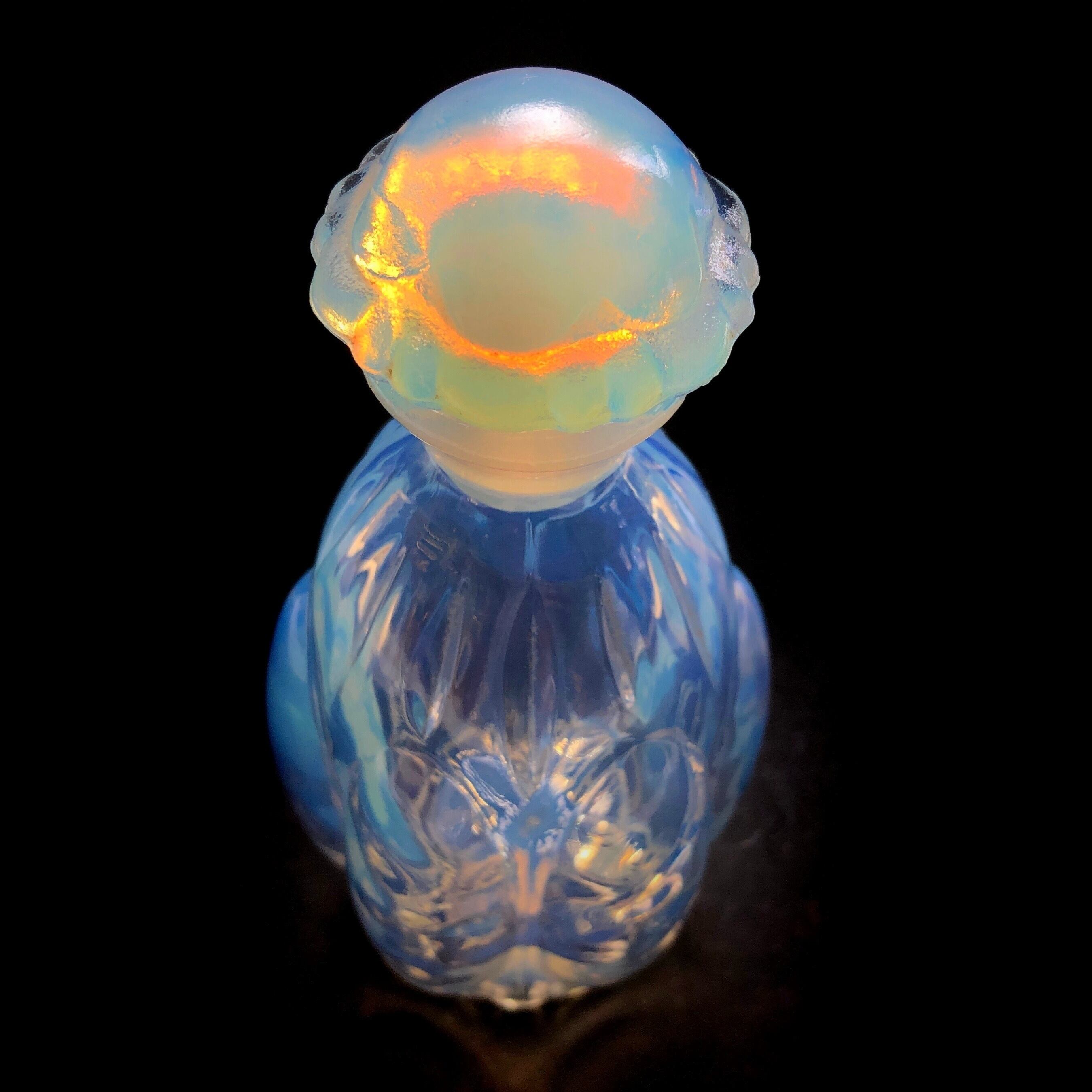 穏やかな夕暮れの海を見ているような気持ちにさせてくれるオパールセントガラスの香水瓶です。オパールセントガラスはガラスらしからぬ柔らかな質感で、薄暗い室内では青白く、光を浴びるとレモン色やアプリコットなどの遊色を浮かべます。