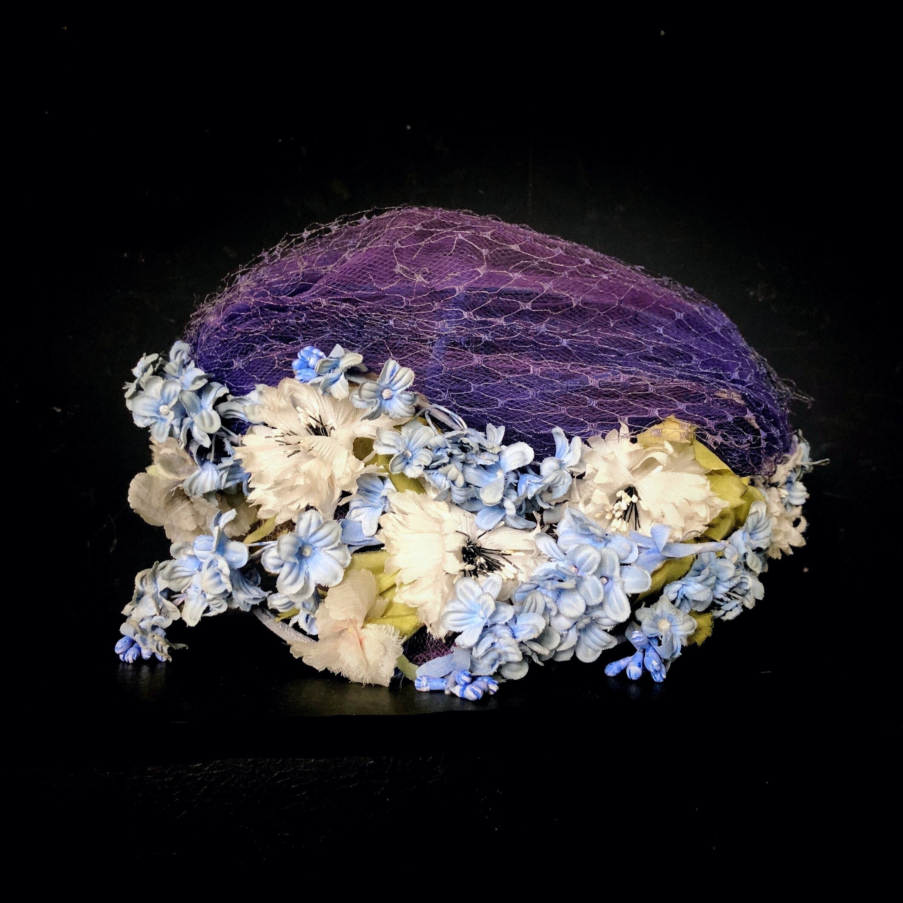 ネットの周りに花が飾られ、前方にはきらりと星のように一粒のフェイクパールのピンが刺さっている、おしゃれな帽子です。ふんわりとした作りの花飾りはどこか、乙女達が野原で編んだ花冠を思わせますが、薄青に白の色彩は華やぐとともに爽やかな印象、紫のネットはいかにも軽やかです。