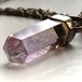 ごく淡い薄紫色のトルマリンのペンデュラムです。ペンデュラムとは元々は「振り子」という意味ですが、かつて水脈や鉱脈を探す際に用いられ、さらに探し求めるものの在り処を指し示す占いの道具となりました。その動きは持っている人の守護霊によるとも潜在意識を反映するとも言われており、自らの心の声に静かに耳を傾ける際に使われるものと考えてよいでしょう。