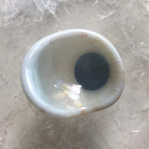 真上から見ると、若干、位置がずれているようにも見えるのですが、そこから、この義眼を円を描くように動かして見てください。黒目が少しだけ動いてこちらを見ているように感じないでしょうか。これによってどの方向に傾けても目が合っているように錯覚するという特徴を持った、義眼におけるモナリザ効果とも言えるのかもしれません。