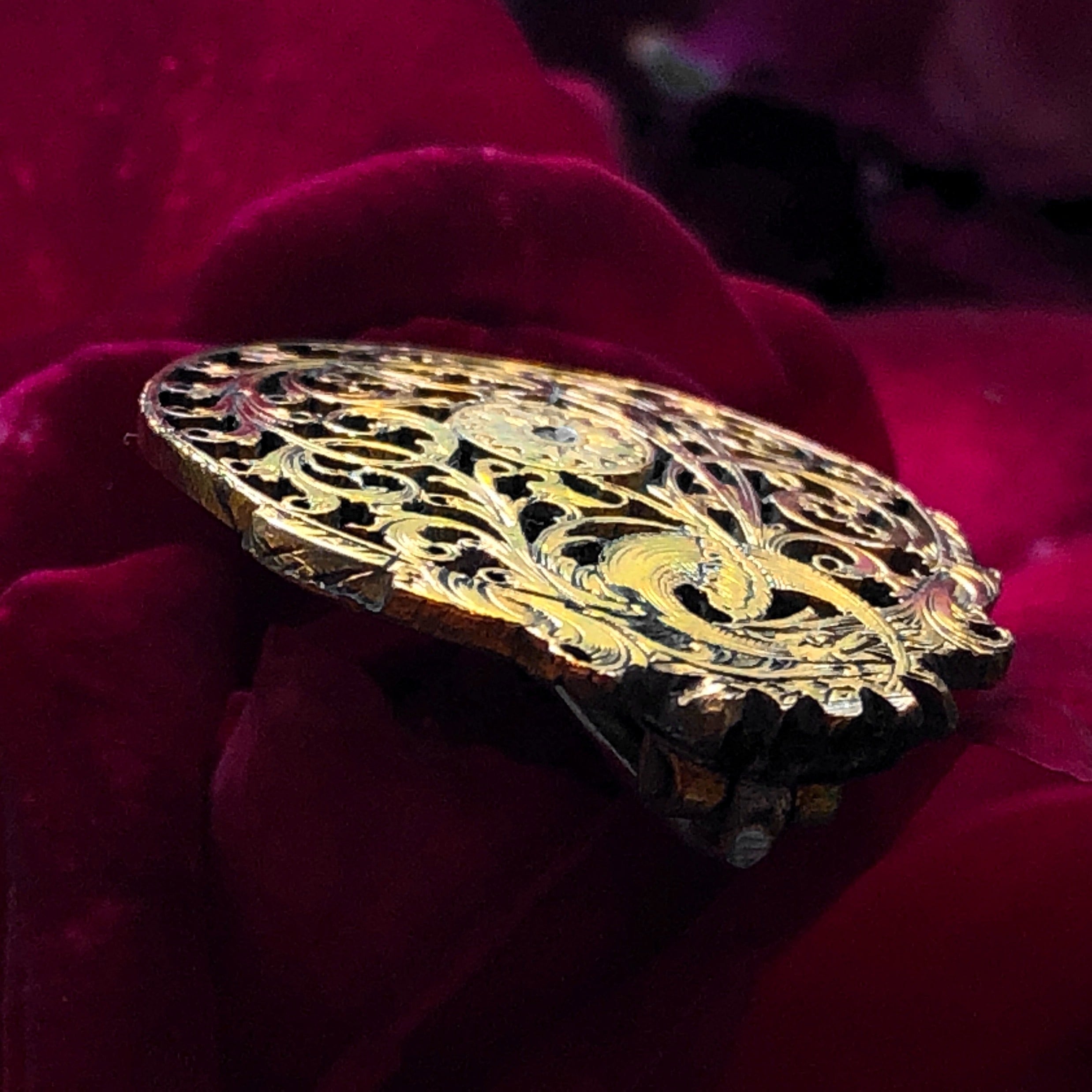 見ていると吸い込まれてしまいそうな、とても細かく優雅な金線細工のブローチです。うねる植物が絡まり、花が咲いているようにも、鳥が隠れているようにも見える、不思議な森の風景でしょうか。