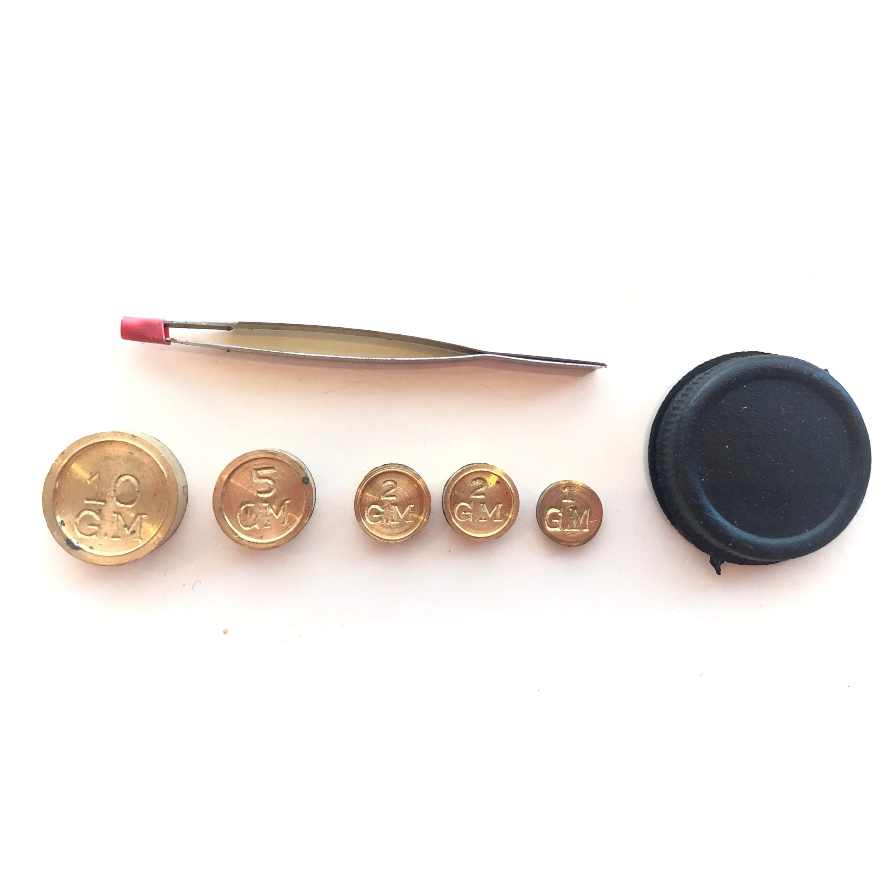 もうひとつ、このお品の特筆すべき点は重りが残っているということです。全て残存しているかどうかはわかりませんが、グラム単位で10、5、2、2、1 と計5個、ミリグラム単位では200、100、50、20、10 と計5個があります。10ミリグラムの切片は打刻がはっきりしないのですが、ミリグラムまで計測するものですので、宝飾用の秤だったのではないでしょうか。古い秤を手に入れても重りは失われていることが多い中で、こちらは比較的よい状態のものが残されています。