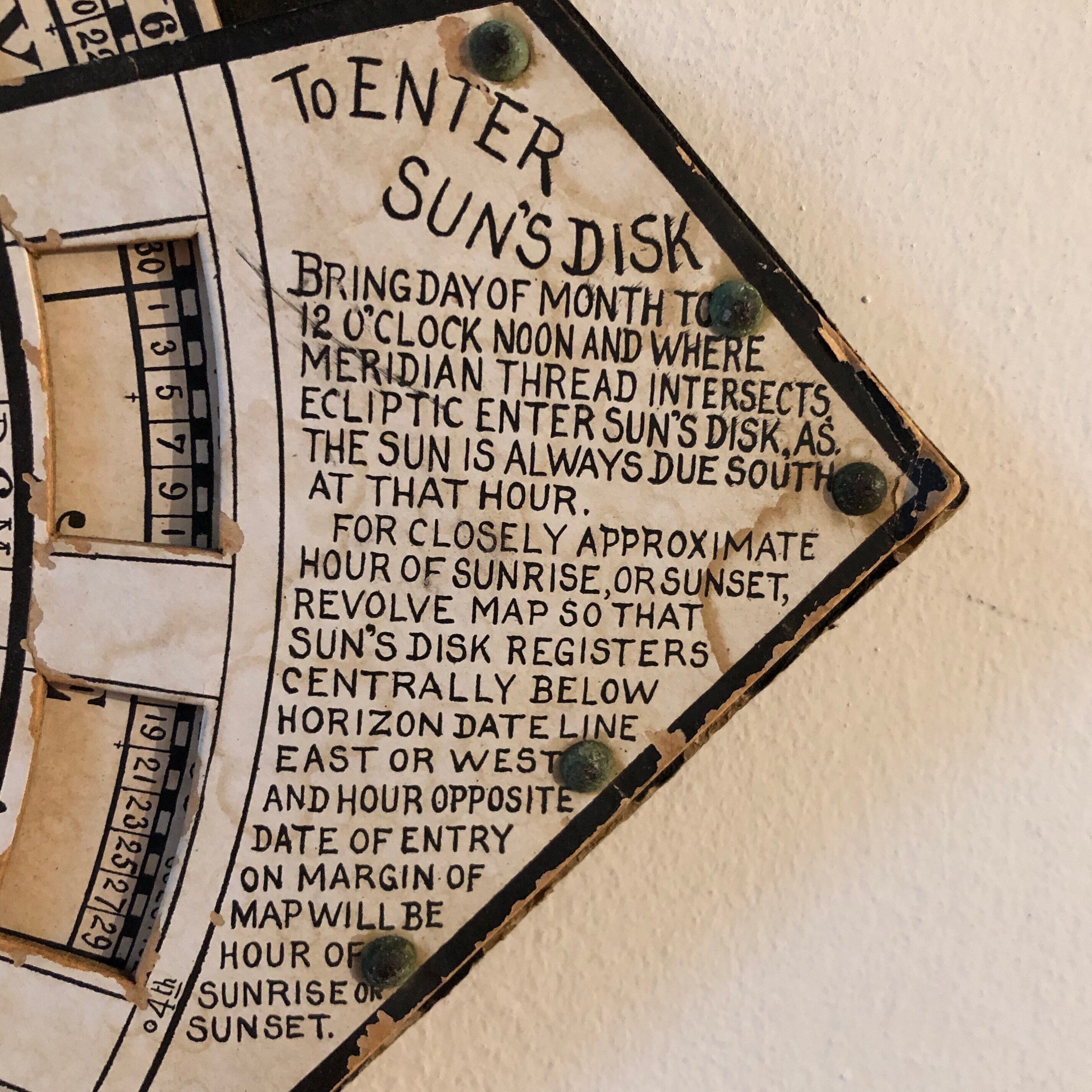 ほぼ同時代のドイツ、イギリスの早見盤と比べると、その色彩やデザインにはモダンだけれどもどこか懐かしいレトロフューチャーな雰囲気が漂います。それもそのはず、SF作家のサービスはもとより、バリットは風刺漫画家でもあったのです。まだ、ライト兄弟の飛行機が空を飛んで間もない頃、すでに多くの人々が宇宙に憧れを抱いていたのでしょう。サービス、バリットのふたりが、夜空を見上げて天空に想いを馳せる人たちに贈ったものがこの "Star and Planet Finder" でした。夢や希望に溢れた想像をさらに掻き立てる道具のひとつだったわけですから、言うならば過去から来た未来を形にしたようなその姿も納得できます。