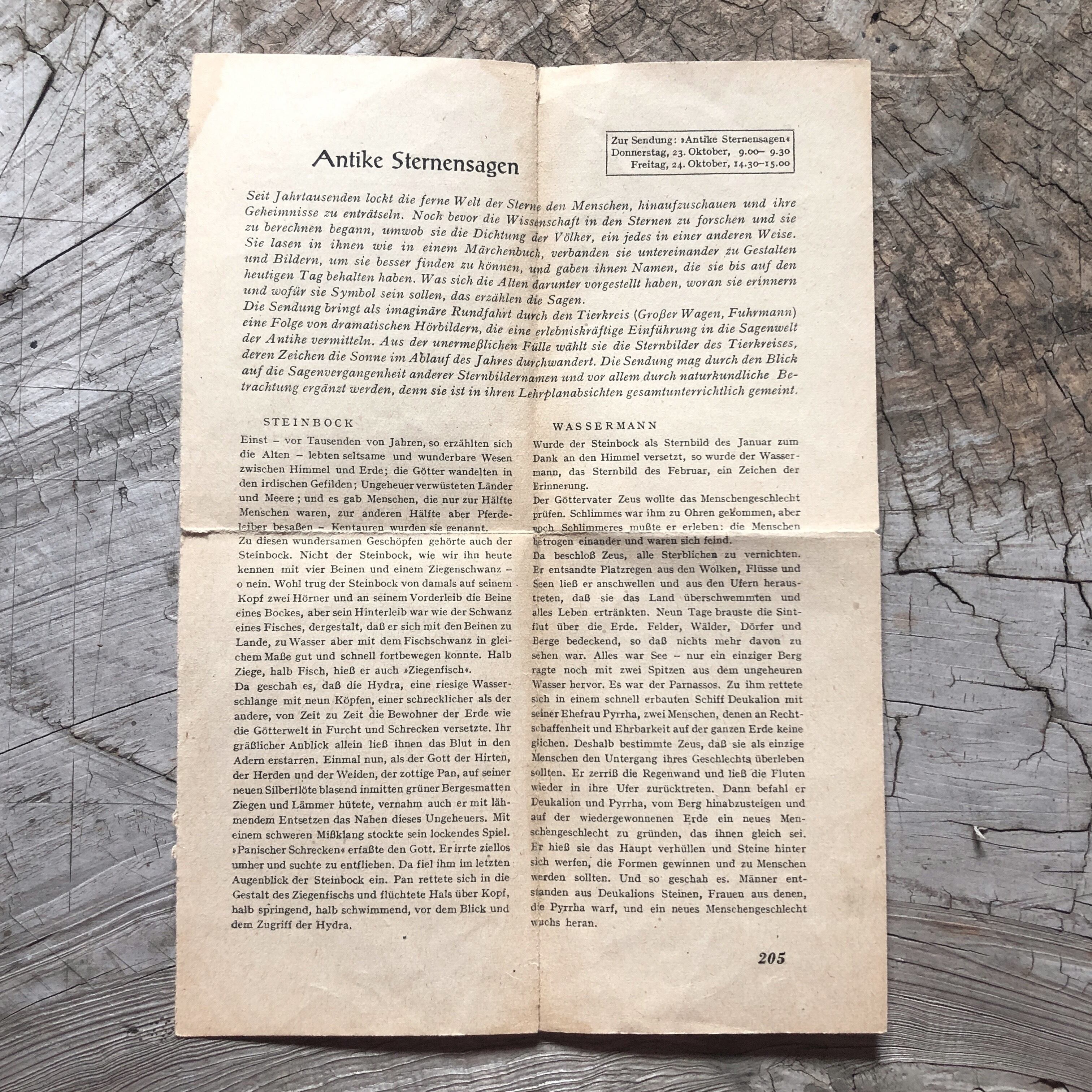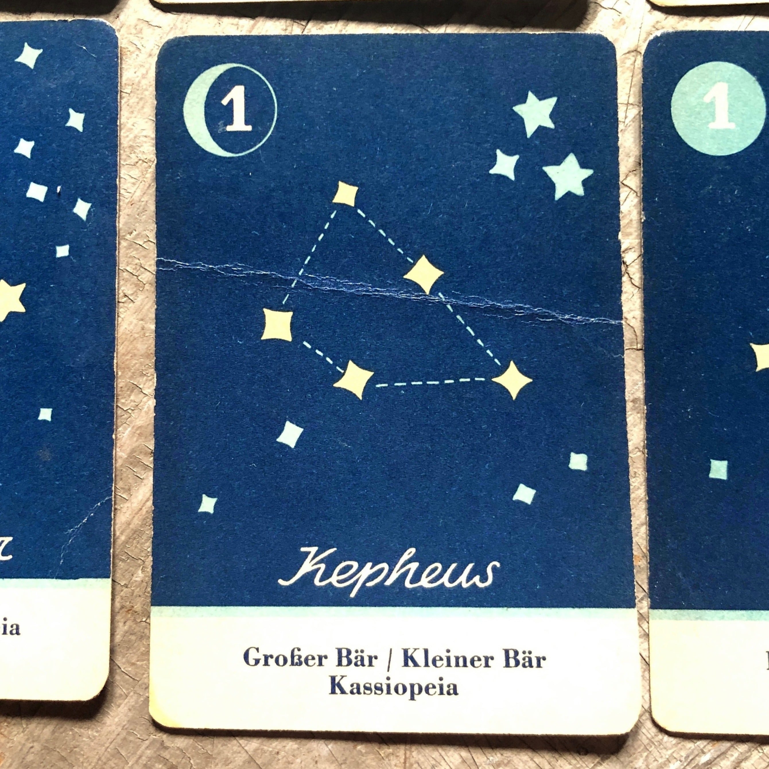 1952年、旧東ドイツ、ライプチッヒ製で、ドイツ語の説明書の他に、星座について解説した本の切り抜きが入っていました。きっと、かつての持ち主がゲームのお供に挟んでおいたものでしょう。