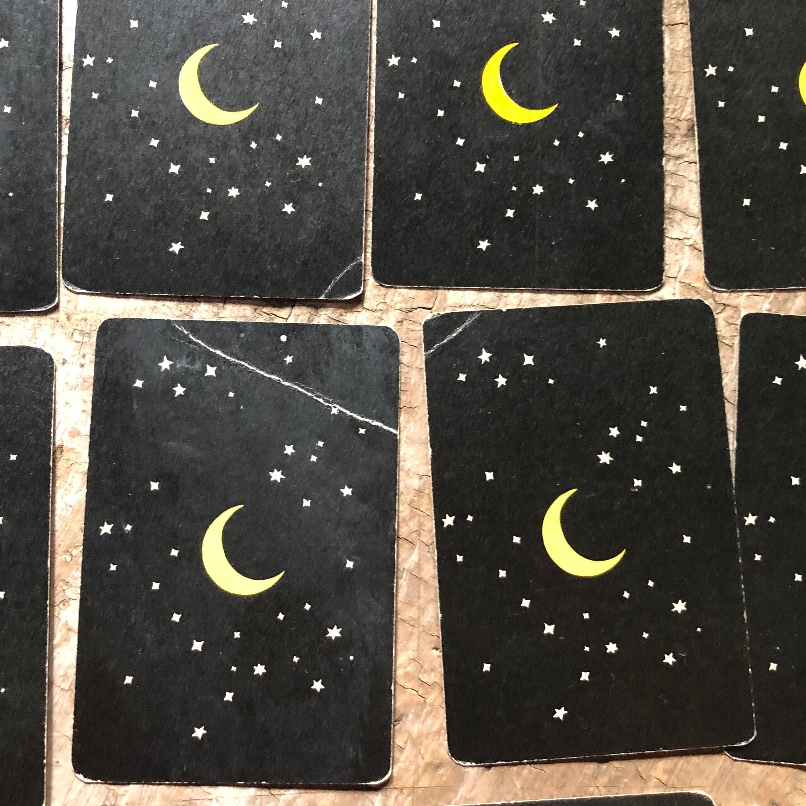 こちらは「星空」という、同じ星座を4枚集めるカルテットです。星座は8種類、カードは4枚ずつで計32枚のコンプリートセットです。シンプルですが、どこかほっとくつろいだ柔らかさが心にしみるデザインで、裏の星と三日月も何とも言えない楽しさと優しさを感じます。このイラストはモーリッツ・ノイゲバウワーという人の手によるものです。