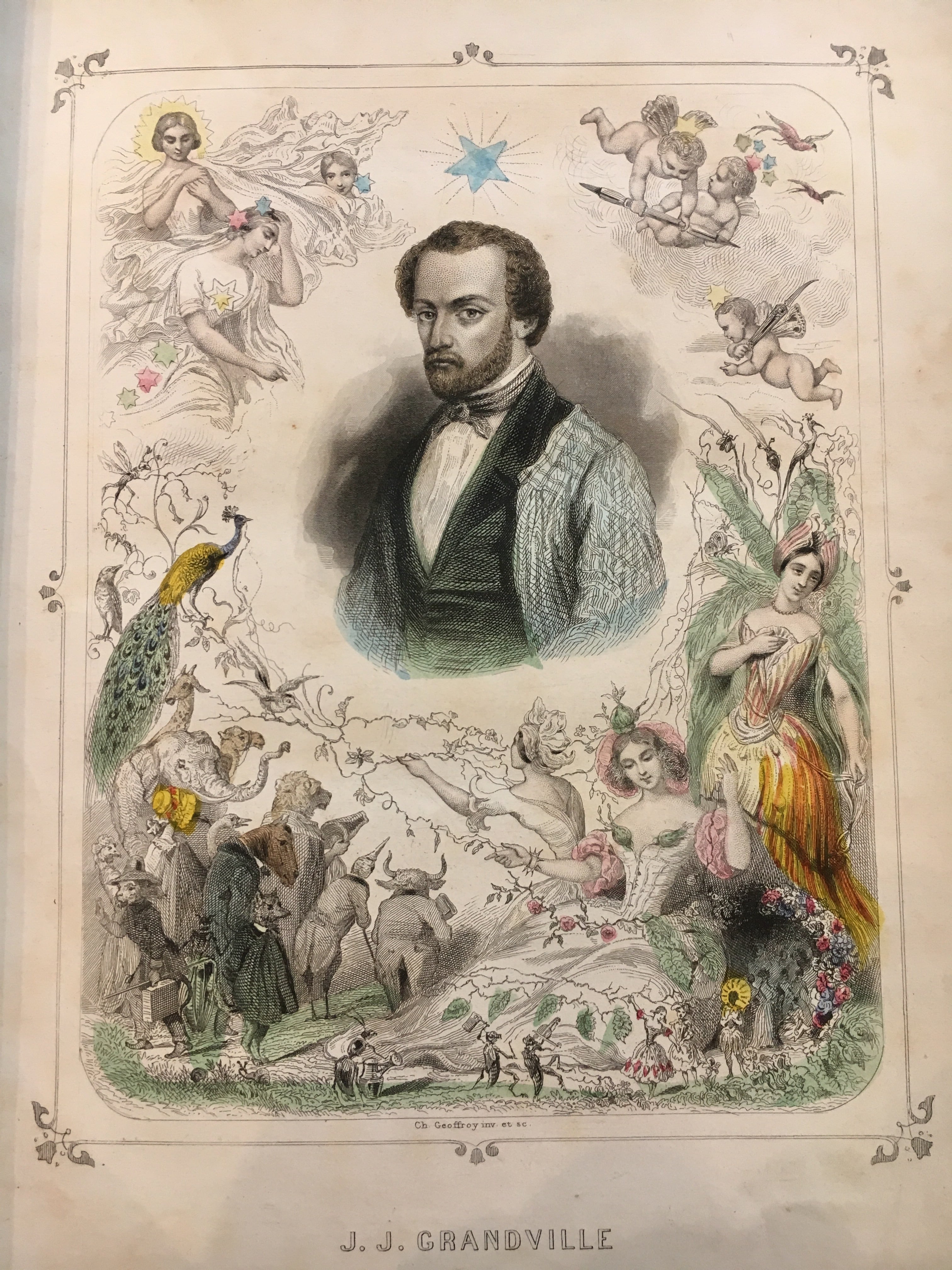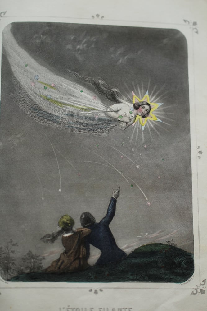 19世紀、フランスの風刺画家 J. J. Grandville による "Les Etoiles" です。「星たち」は、彼の他の作品と比べて版が少なく、挿絵1枚でも希少なものとして扱われております。その「星たち」を、各挿絵はもちろん、表紙、扉、自画像なども含めて、丸ごとグランヴィルの世界として楽しんでいただける本です。サイズは、約26×19センチ、表紙と背の間に擦れと4センチ程度の切れがあります。